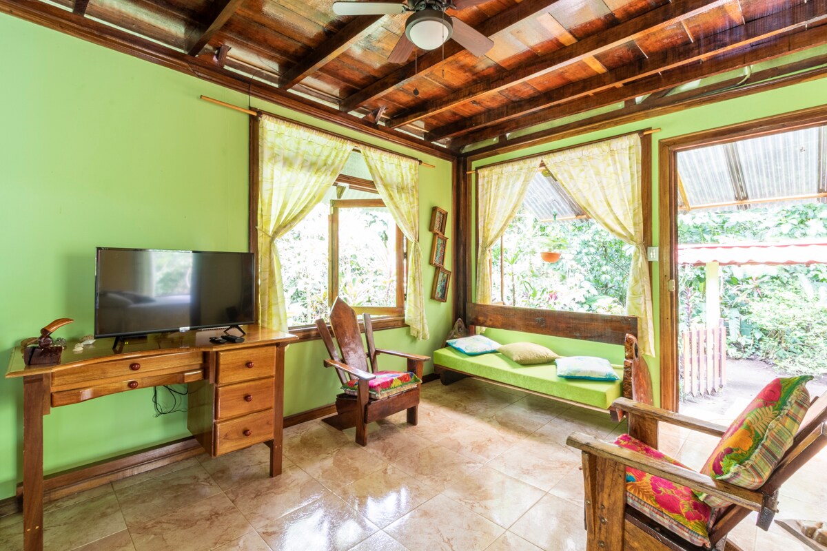 Acogedora cabaña, totalmente equipada con cocina, AC y mobiliario básico ideal tanto para estancias cortas como largas; combina un diseño rústico con un toque contemporáneo. Es la parada ideal para los viajeros que buscan un lugar cómodo y práctico para alojarse entre el Aeropuerto Internacional Juan Santamaría y las hermosas playas de la costa caribeña. Relájate rodeado de las maravillas de la selva tropical del Caribe costarricense. Flores, riachuelos y cascadas te invitarán a quedarte.