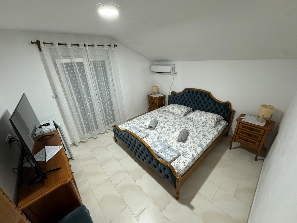 Este departamento nuevo y elegantemente diseñado, que forma parte de una villa, cuenta con un lujoso dormitorio con una cama doble, una amplia sala de estar con sofá cama y sillón plegable, una elegante cocina con estufa y horno, un baño con ducha y lavadora. La increíble terraza ofrece una vista panorámica del lago Skadar. Disfruta de privacidad y lujo con WiFi, TV, ropa de cama, toallas y estacionamiento. Disfruta de excursiones privadas en barco, kayak, un restaurante de pescado y nuestro vino casero del viñedo familiar.