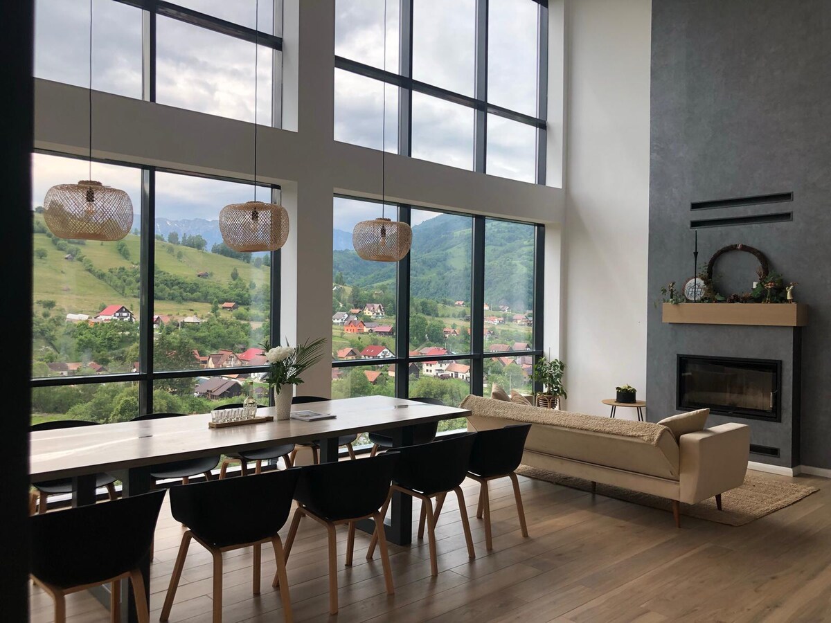Chalet Sirnea con pared de cristal y vistas a Bucegi