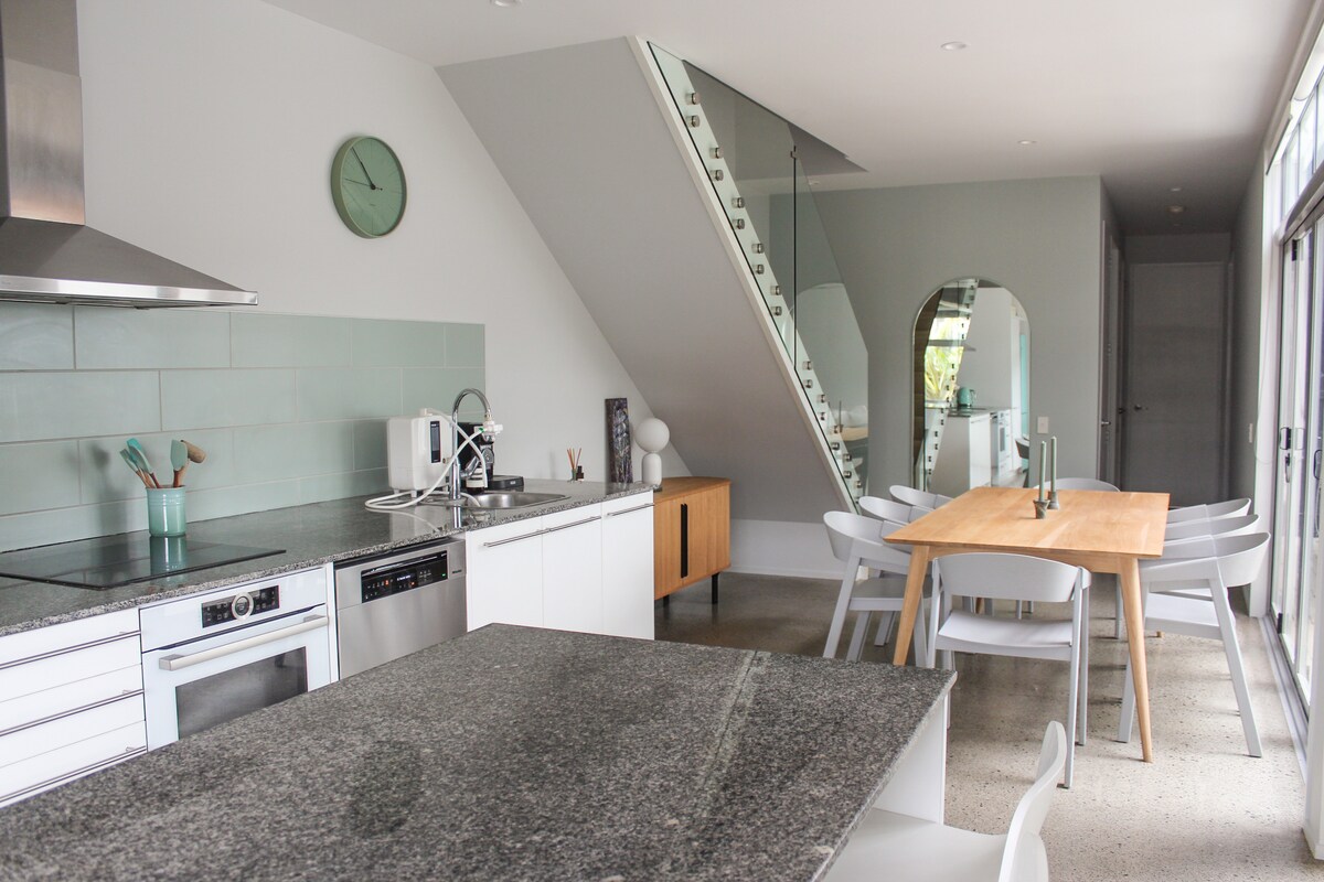 Bienvenido. Este espacio ha sido cuidadosamente diseñado para tu comodidad. Te sentirás relajado en cuanto llegues y disfrutes de las vistas panorámicas del océano con una vista impresionante de las islas Hen and Chicken y Sail Rock. Experimenta la hermosa artesanía en todo el espacio, los gabinetes de roble americano y una paleta de colores relajantes que funcionan en armonía con el entorno rural y costero. Dormirás bien en el colchón de espuma viscoelástica fabricado en Nueva Zelanda con ropa de cama de lino de calidad.