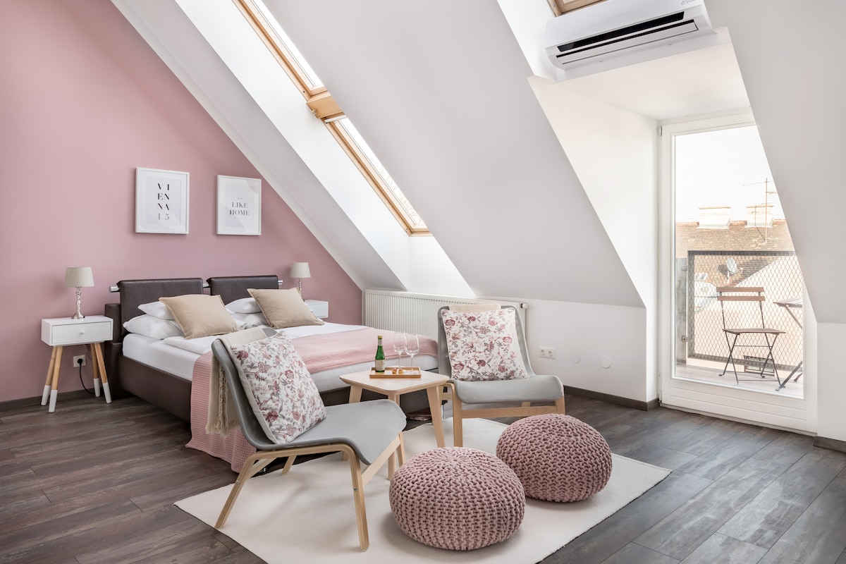 Stylish 40 m² design apartment in a quiet courtyard setting – ideal for restful nights in Vienna. Enjoy a king-size bed under the sloped ceiling, air conditioning, fast Wi-Fi and a Smart TV with Netflix. The fully equipped kitchen is perfect for short or longer stays. Relax on the private balcony with rooftop views. Just 2 minutes to the metro and around 10 minutes to the city center. Ideal for couples, solo travelers and business trips.