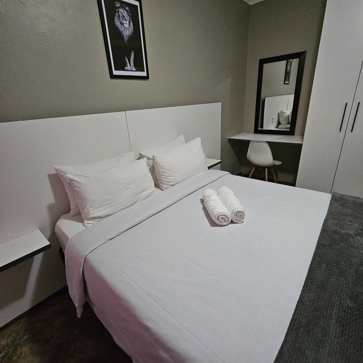 Pafuri Self Catering – Executive Suite | Polokwane Modern, air conditioned executive suite ideal for business travellers or couples. Features a private bedroom, bathroom with shower, and a fully equipped kitchenette with stovetop, fridge, microwave, and kitchenware. Enjoy streaming services on the TV or relax on your private patio. Conveniently located in Penina Park, close to Mall of the North, Savannah Mall, Polokwane Game Reserve, hospitals, and major access routes.