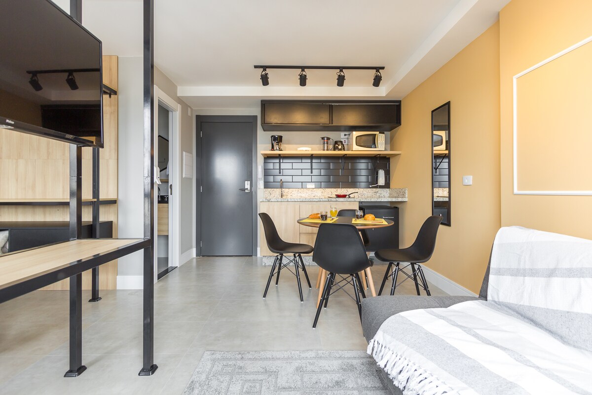 Loft / Estudio ubicado en lo mejor de Ecoville, el barrio más sofisticado y deseado de Curitiba. Cuidadosamente decorado y diseñado para ofrecer practicidad y comodidad al huésped. El espacio cuenta con una pequeña cocina con todos los elementos necesarios para comidas rápidas. Ropa de cama, toallas, secador de pelo, plancha, etc. Zonas comunes: Lavandería, Coworking, barbacoa, Cocina, etc. 1 plaza de garaje incluida. Restaurante, panadería y farmacia a menos de 50 metros.