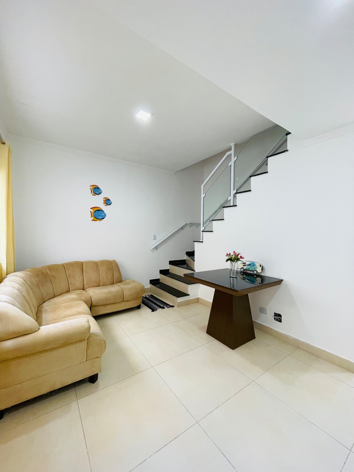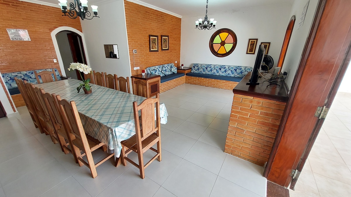 Linda Casa en Mongaguá, a 90 metros de la playa. Excelente espacio exterior con piscina, parrilla/horno y estufa de leña para hacer una barbacoa o una comida con mucha diversión junto a la piscina. Sala de estar con mesa de billar y ping pong. Internet WI-FI NETFLIX Sistema de alarma Total de 3 dormitorios (4 camas individuales y 2 dobles, con 7 colchones adicionales). La casa tiene 3 baños en total. Casa de tierra, excelente para personas con movilidad reducida.