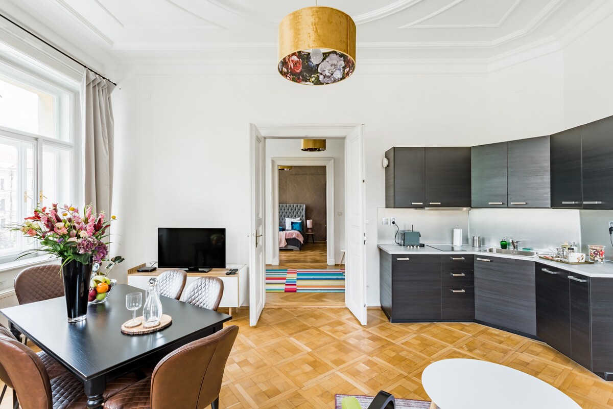 Disfruta de tu estancia en mi hermosa casa Jugent Stil construida en la década de 1890, pero recientemente renovada con todas las comodidades modernas que uno podría desear, incluido el aire acondicionado incorporado en todas las habitaciones. Apartamento de dos dormitorios bellamente decorado con techos altos históricos decorados con molduras de estuco ornamentadas, muebles de mediados de siglo y modernos en todas partes, baño con bañera grande y aseo separado. El lugar ideal para sentirse como en casa mientras estás en Praga, ya sea para un viaje de fin de semana, un viaje de negocios o estancias más largas.