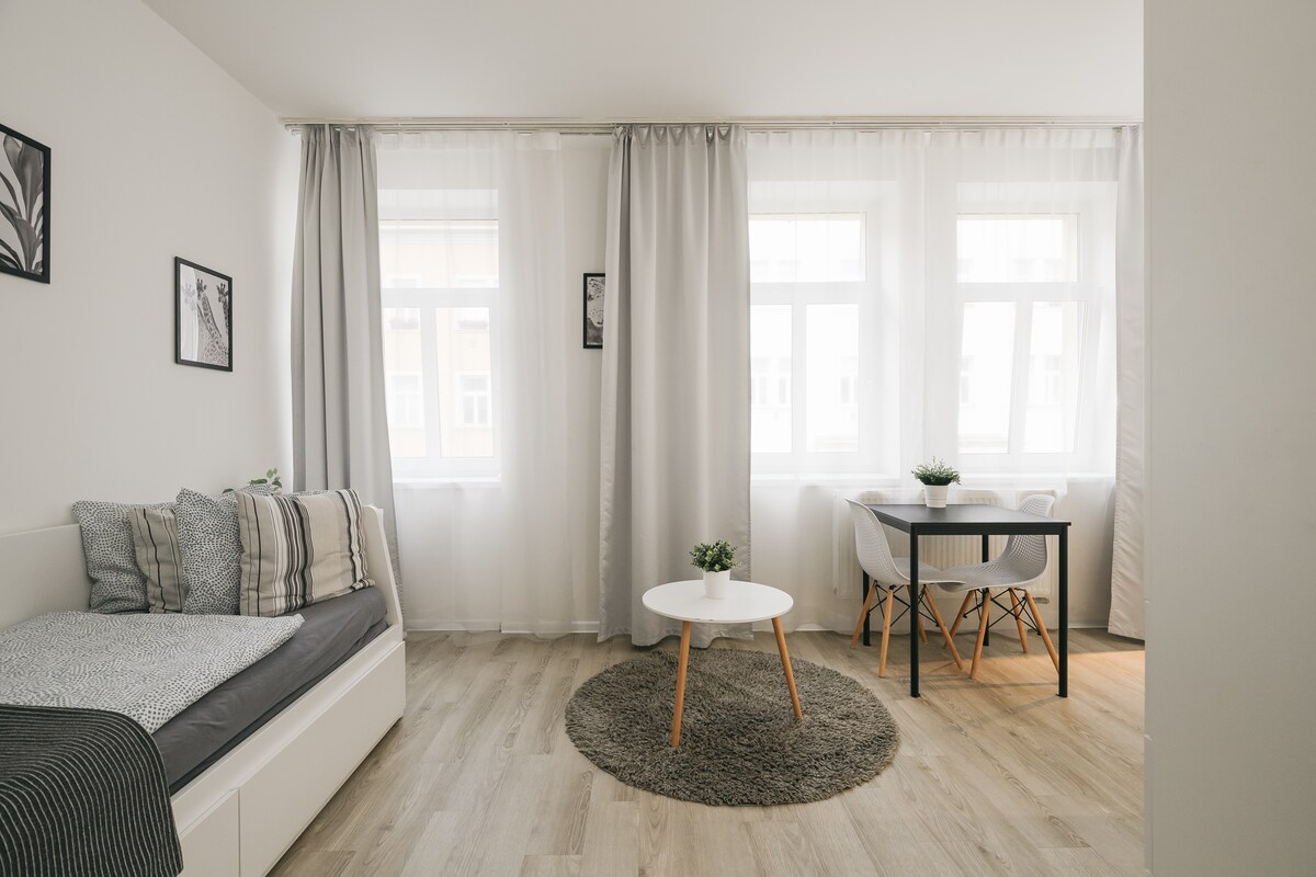 Este apartamento de lujo se ha completado recientemente. Está situado en el centro de la ciudad, Praga 1 - Ciudad Nueva. La plaza Wenceslas está a 10 minutos a pie y la plaza de la República a 5 minutos a pie. Hay una cocina bien planificada en el apartamento, una cómoda sala de estar y TV inteligente. El dormitorio tiene una cama tamaño king, TV inteligente y armario. El baño tiene ducha a ras de suelo e inodoro.