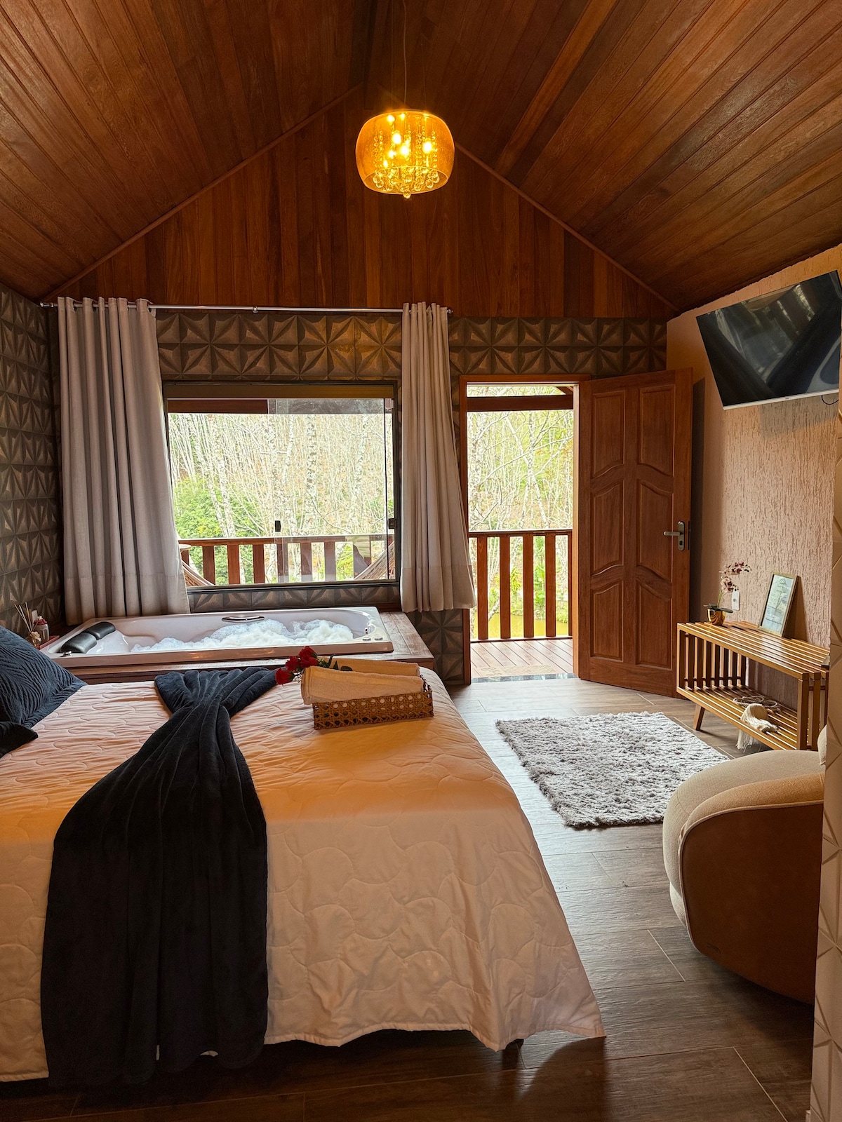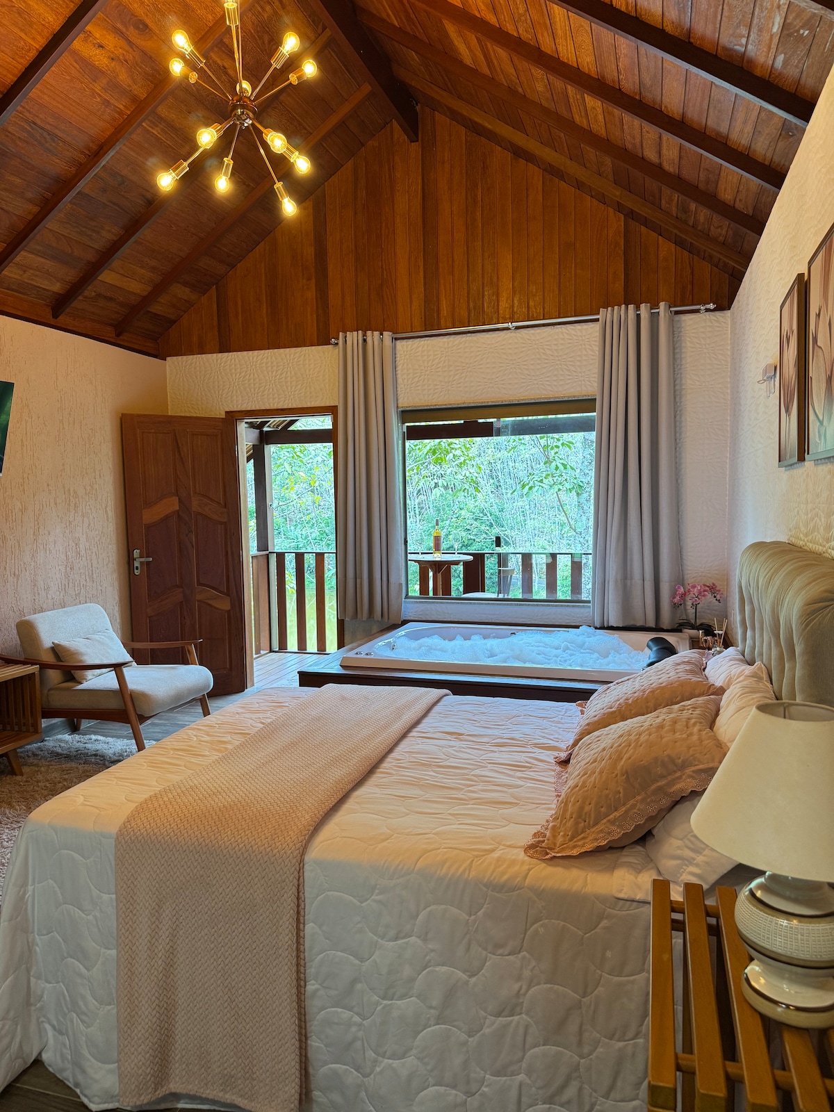 ¡Nuestro Bangalo tiene dos suites, una suite principal con cama king size, colchón Emma y bañera de hidromasaje! Nuestra segunda suite tiene una cama doble Nuestra casa tiene una cocina totalmente equipada, una mesa grande en la sala de estar, un sofá cama de 3 metros en la sala de estar y un televisor inteligente de 55 pulgadas con canales desbloqueados. En el exterior tienes una ecosauna. Nuestro espacio está totalmente equipado y listo para que vivas días extraordinarios, rodeado de naturaleza, puedes ir a las playas de Guarapari en 20 minutos y a la cascada en 5 minutos