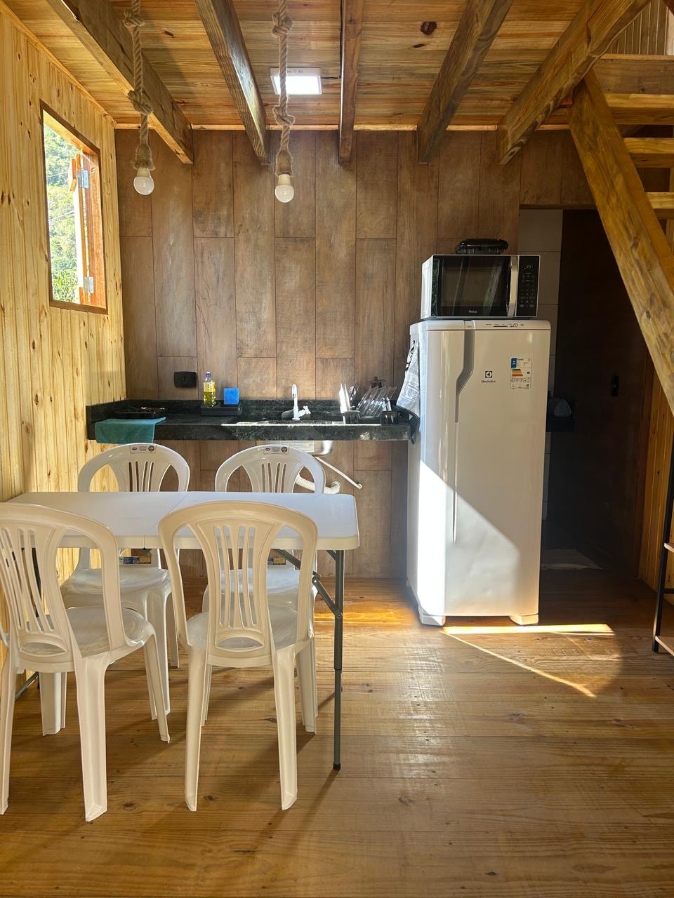 Chalet suizo con una estructura moderna, sostenible y única, integrado en la naturaleza con una vista increíble de las montañas y la bahía de Paraty. Situado en la zona rural a 9 km del centro de Paraty y a 3 km de las playas, donde se pueden escuchar los rincones de las aves. Espacio: El chalet tiene un dormitorio abierto con una cama tamaño queen en el entresuelo con vistas al mar, 1 baño equipado con toallero térmico. La cocina está completa. Habitación con mesa y dos sillones, sofá cama y proyector superior con acceso a Netflix.