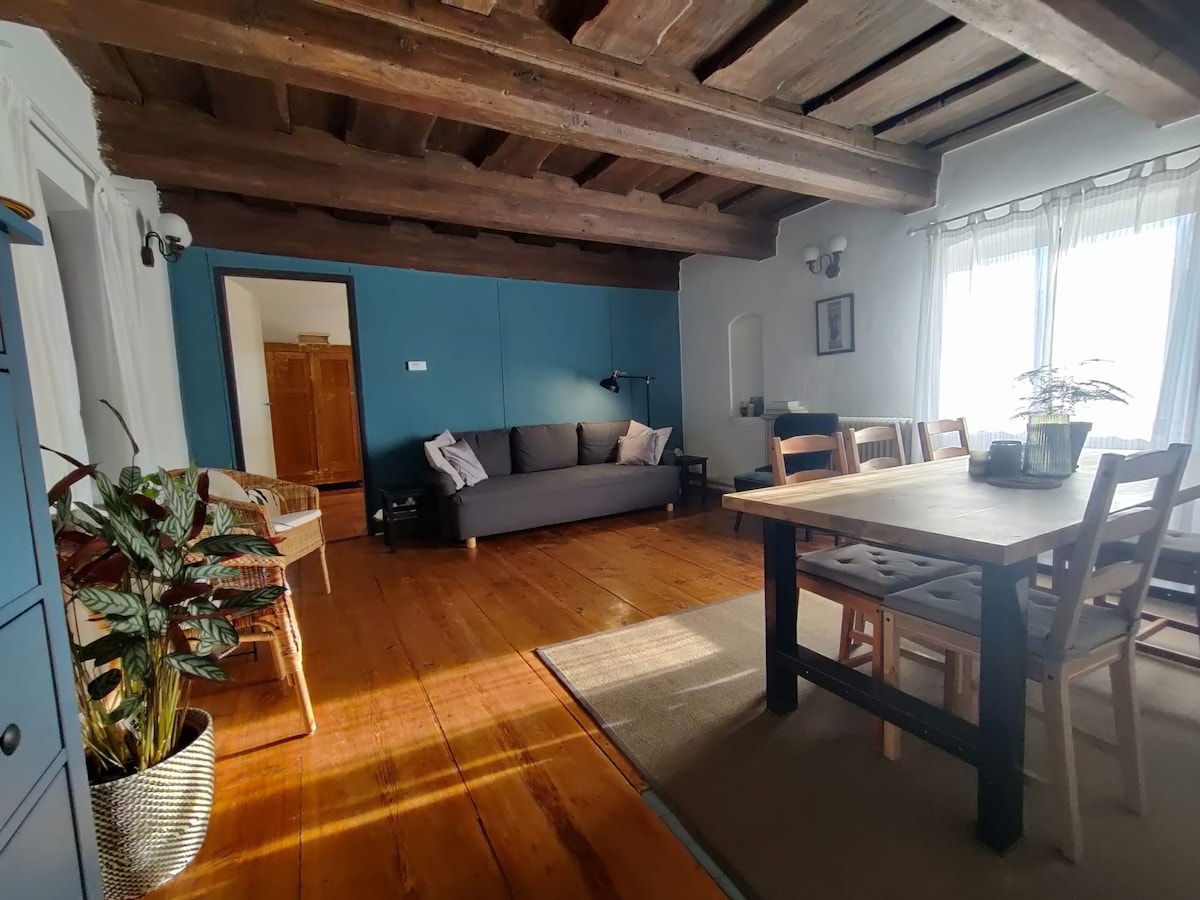 Apartamento tranquilo y romántico en pleno centro con vistas al castillo, con suelos de madera originales renovados, cocina totalmente equipada con electrodomésticos y cafetera. El apartamento tiene su propio baño con inodoro. TV SMART con Netflix y WIFI de alta velocidad. ¡Está prohibido fumar! TAMPOCO SE PERMITEN PERROS debido a los suelos históricos. El apartamento está diseñado como una habitación parcialmente separada con una cama doble y una cocina con un sofá pequeño, donde otra persona puede dormir si es necesario. Planta baja elevada, 7 escalones.