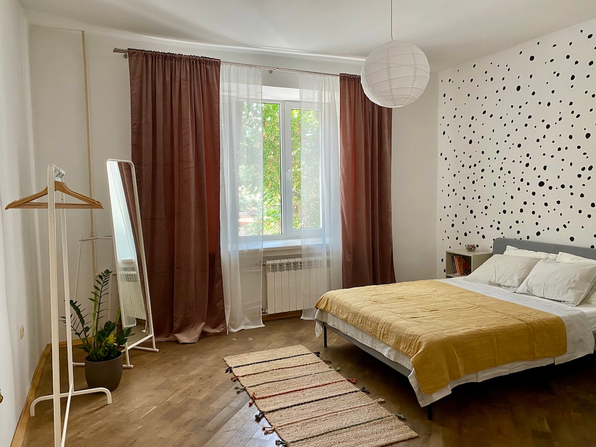 A stylish apartment in the center, designed in Scandinavian style with vintage furniture and modern art. It is located a 15-minute walk from the beach and 10 minutes from the central park, surrounded by many restaurants and bars. A pre-revolutionary building with a cozy Odessa courtyard. The apartment features a separate bedroom with a double bed and a comfortable sofa bed in the living room. The apartment is fully equipped with everything you need.