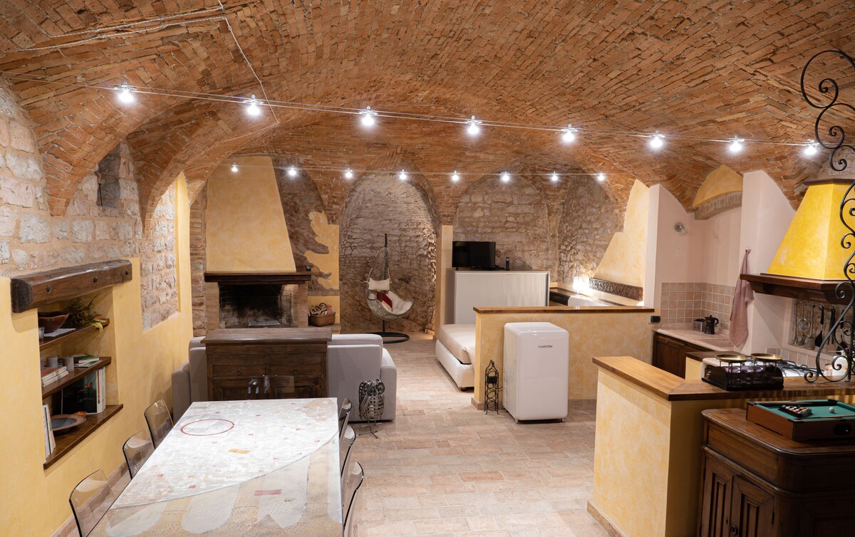 Es un loft en un edificio del siglo XVII en el centro histórico, en una calle peatonal junto a las Torres Properzio. Está en dos niveles: planta baja con un gran espacio abierto con almuerzo, área de cocina, sala de estar con chimenea y área con cama doble, en el piso debajo del baño. El lugar tiene aire acondicionado. Las bóvedas de ladrillo, las paredes de piedra y el antiguo piso de terracota lo hacen único.