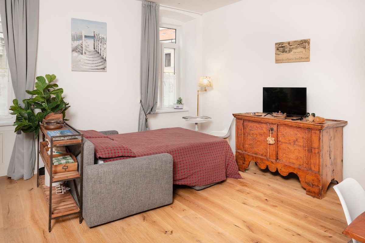 Our bright apartment is located in the heart of the old town, near the sea, close to San Giusto castle and piazza dell’Unità d’Italia. It has been our home for a long time and when we had to move in, we renovated and restored it with care, adapting it to the needs of future guests. You will find everything you need to enjoy your stay. We are sure that you will also love it.