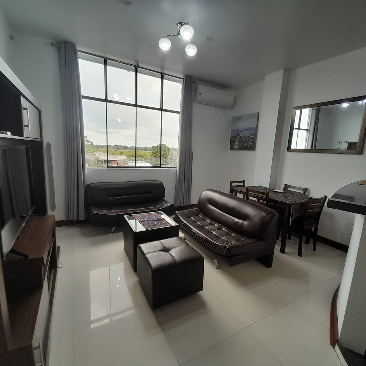 Departamento cómodo y céntrico en Pucallpa. A unas cuadras de la Plaza de Armas, cerca de tiendas y restaurantes. Cuenta con cama grande y cómoda, sala con sofá y TV, comedor, cocina equipada, escritorio para trabajo remoto, internet rápido, cerradura digital y ventanas con buena luz y ventilación. Ideal para descansar o trabajar sin perder ubicación y confort. Perfecto para tu estadía en la ciudad. ¡Te sentirás como en casa!