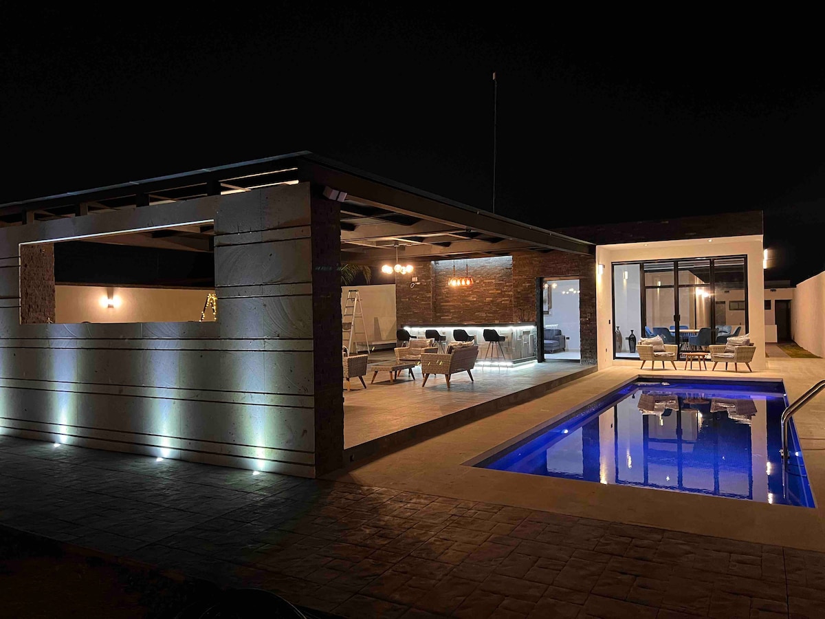 Relájate en este espacio tranquilo y elegante. Disfruta de un amplio jardín, con cancha de fútbol, con piscina a buena temperatura, servicio de bar y área para carnes asadas. Smart Tv con NETFLIX HBO AMAZON Y DISNEY disponibles y wifi gratis y equipo de karaoke. Juegos infantiles y tiendas de campaña por si deseas dormir en el jardín y pasar una velada relajante lejos de la ciudad. Excelente lugar para fiestas o reuniones.