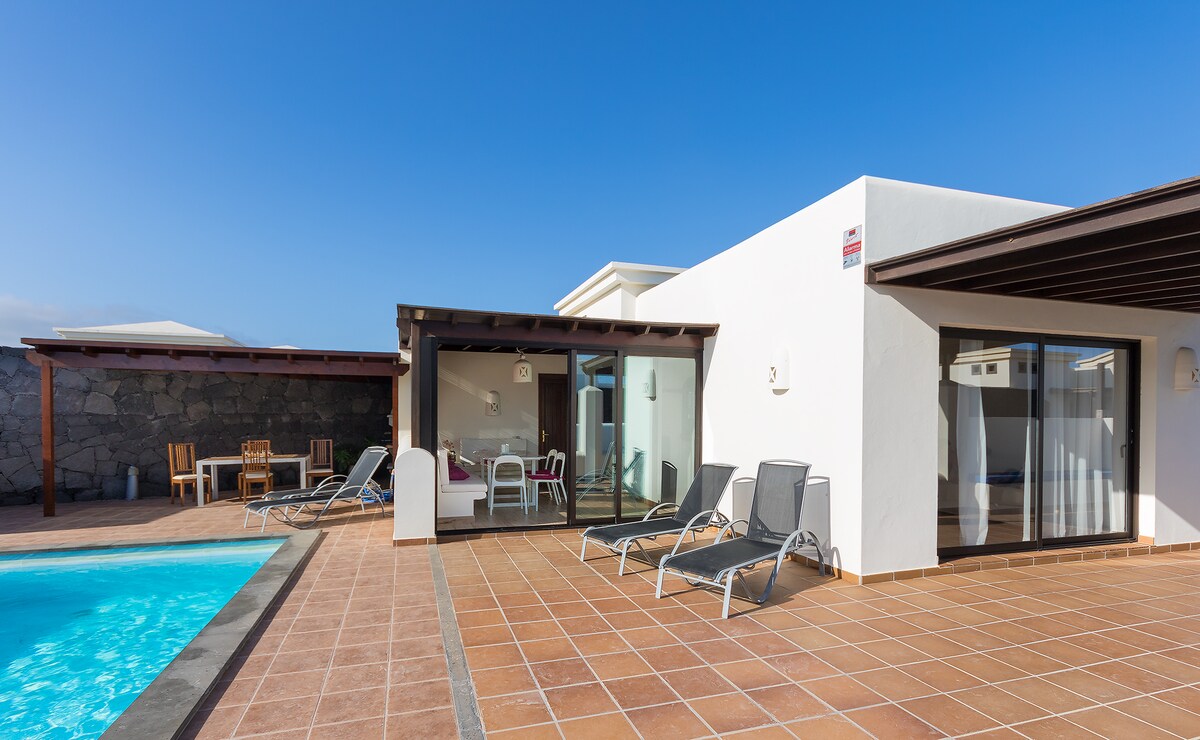Bungalow adosado situado en la ladera del volcán de Montaña Roja en una zona residencial a 2,5 km del centro de Playa Blanca . Tiene un salón con cocina,dos habitaciones,una con cama de matrimonio y la otra con dos camas individuales.Un baño completo con una gran ducha y dos terrazas privadas con barbacoa, hamacas,jacuzzi y piscina para uso exclusivo de nuestros clientes. Aire acondicionado en las habitaciones y en el salón.Alojamiento con licencia turística.