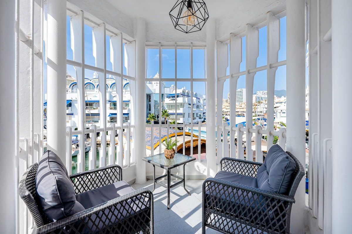 El apartamento se encuentra en la lujosa zona residencial de Puerto Marina Benalmádena. Por su situación es único, en la zona de Poniente, la parte más tranquila del puerto. Está localizado frente al mar y los yates, justo encima de los atraques y pegado a la playa de Malapesquera, una de las más famosas de la Costa del Sol. A sólo unos pasos está el Centro Comercial, continuándose la zona de restaurantes y tiendas hasta llegar al otro extremo, la zona de Levante, repleta de bares de copas.