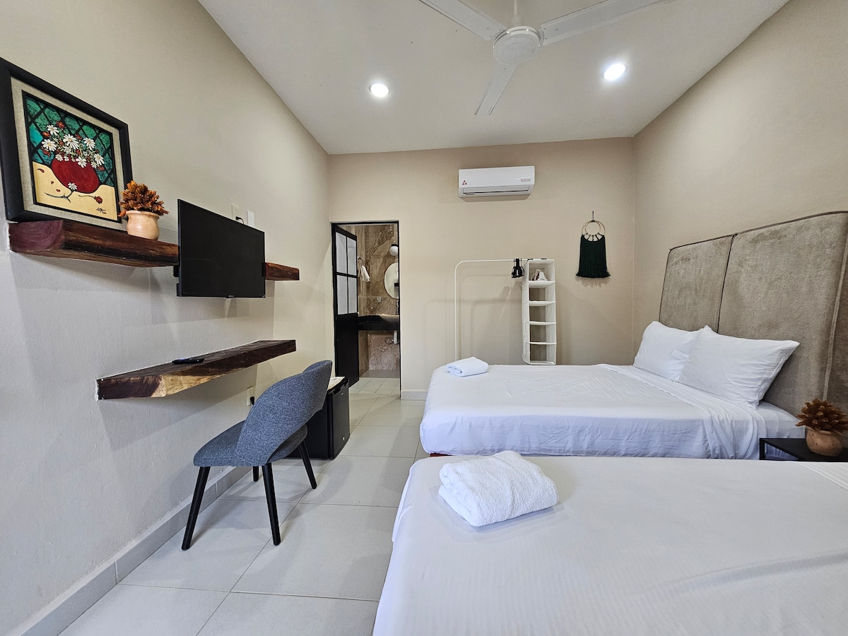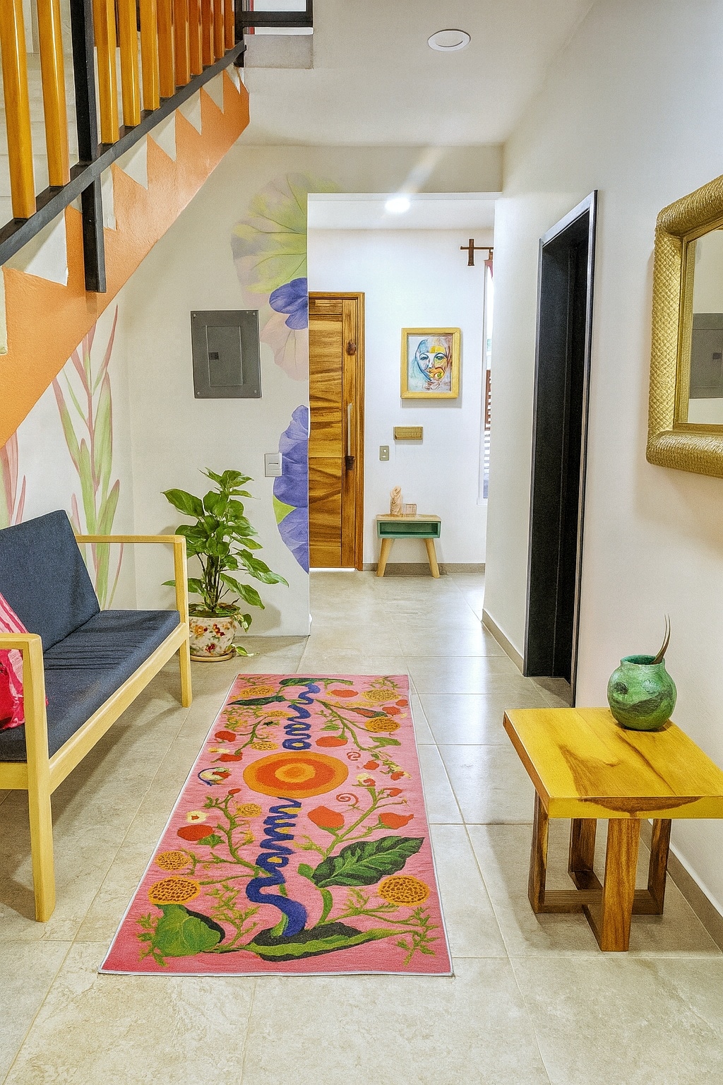 Depa amplio y luminoso en planta alta con 2 camas queen súper cómodas, A/C en la recámara y ventiladores en sala y cocina. Cuenta con cocina equipada, salita acogedora y balcón con vista a palmeras. Estás a solo 2 min de la playa y a 1 min de cafés, tiendas y restaurantes. Disfruta el patio compartido con hamacas, árboles frutales, asador y área de pesas artesanales. Ideal para relajarte, surfear o trabajar remoto con buena vibra. 🌴
