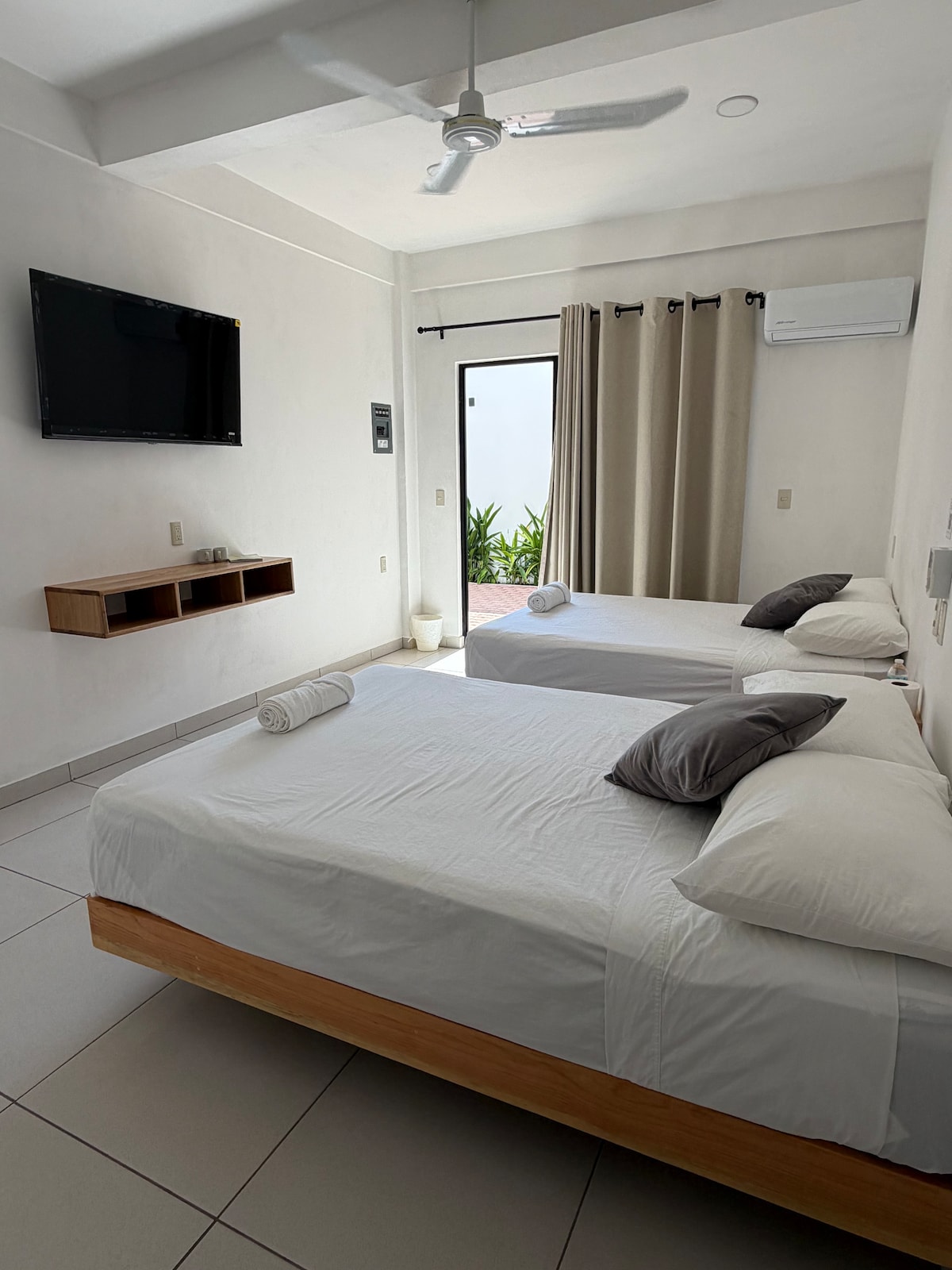 La habitación doble está en planta baja, ofrece un espacio cómodo, fresco y tranquilo, ideal para descansar o trabajar remoto. Su diseño boho-tropical, crea una atmósfera relajante perfecta para una estancia agradable. Cuenta con 2 camas queen size, A/C, ventilador, TV, WiFi, baño privado, frigobar, cafetera Nespresso y barra de cocina. Como huésped podrás disfrutar de las áreas comunes como la alberca, salón de coworking, sala de estar, cocina equipada y circuito de vigilancia.