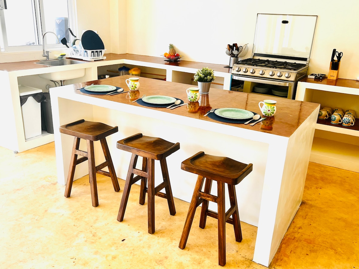 Disfruta de la vista de la bahía desde tu terraza privada o de un hermoso atardecer mientras cocinas, desde tu hamaca o incluso desde la comodidad de tu cama con Aire Acondicionado! Un lugar moderno y minimalista con el toque mexicano. El área de arriba está abierto, excepto por el cuarto. Cuenta con Starlink para asegurarte la conexión a internet, el baño tiene agua caliente, y la cocina está equipada con todo lo necesario. La casa es toda para ti.