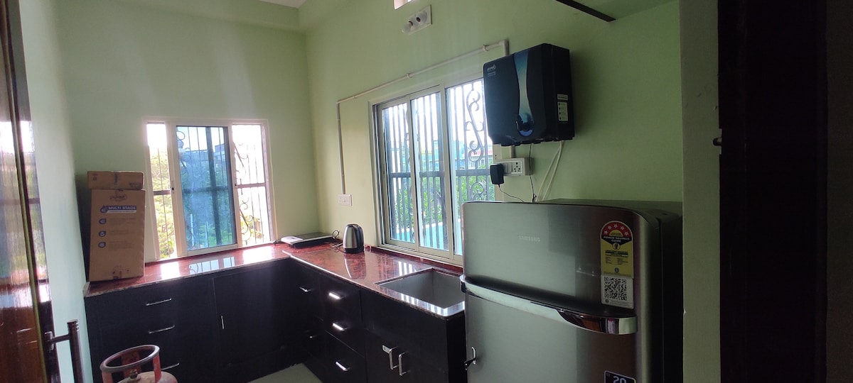 Una casa AMPLIA y AIREADA (232 m²) de un solo piso con 2 dormitorios y cocina, patio delantero y patio trasero 100 % DE PRIVACIDAD y SEGURIDAD para los huéspedes con ocupación independiente de la casa completa. Zona RESIDENCIAL TRANQUILA a 3,1 km /10 de la zona DEL TEMPLO JAGGARNATH y BLUE FLAG Beach. A LO LARGO de la ruta de autobús a BHUBANESWAR. Conectividad 24/7 con las principales atracciones de PURI y sus alrededores. ESTACIÓN DE AUTOBUSES, TEMPLO GUNDICHA, (900 m) ESTACIÓN DE TREN (2 km/10 minutos). Swiggy y Zomato están disponibles. Los cargos de cocina son de 500 por día.