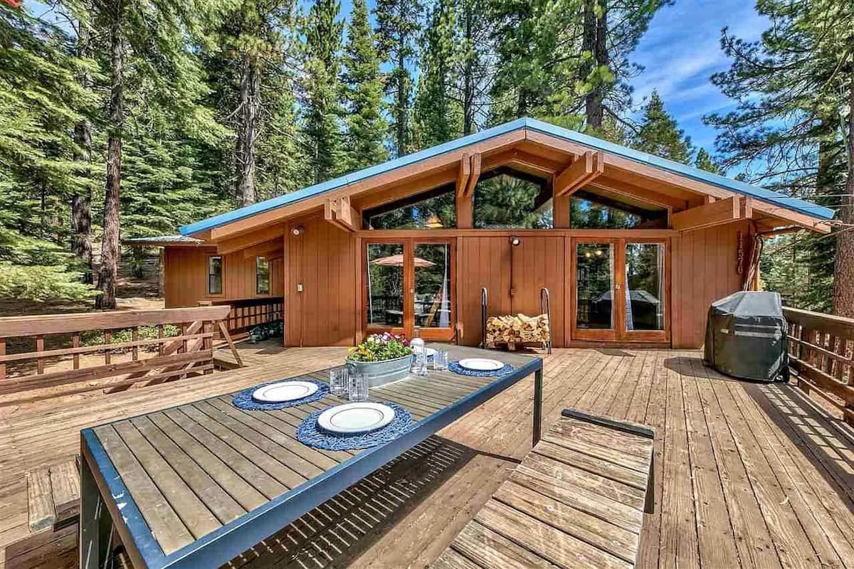 Recientemente remodelado con toques de diseño de alta gama y modernos, ¡y un jacuzzi en la terraza trasera! Sala de estar de una sola planta y de concepto abierto, cocina del chef con cocina de gas de gama alta, mesa de comedor más grande y asientos adicionales en la barra del desayuno, puerta que se abre a pinos frescos, gran terraza y gran área abierta para que los niños jueguen. Loft de lectura para niños, literas, mesa de arcade, televisores inteligentes. Ubicado en el vecindario del centro vacacional de Tahoe Donner, los huéspedes tienen acceso a piscinas, saunas, gimnasio y otros servicios.