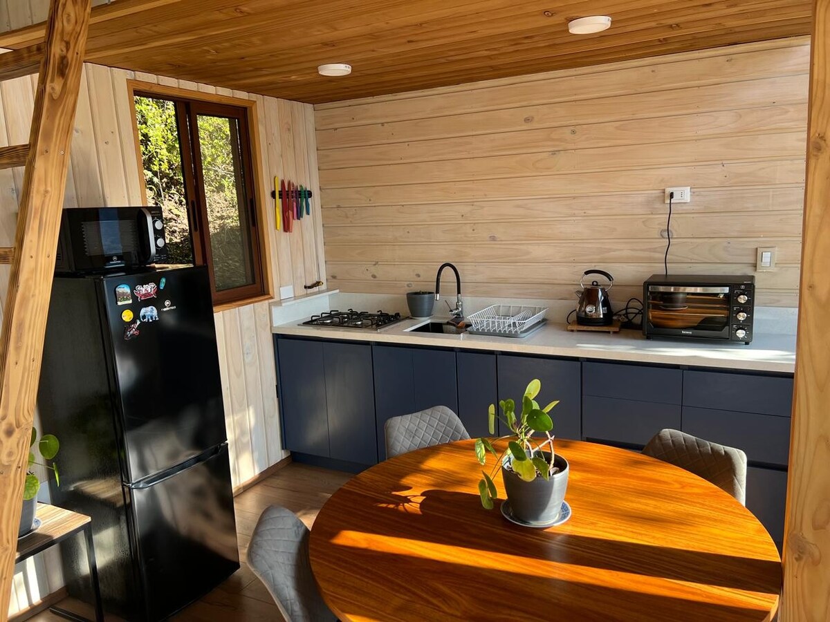 Relájate en este espacio fresco, elegante, moderno y natural. Totalmente equipada y sin cargos adicionales. Ubicada en reconocido condominio con seguridad las 24 hrs. Esta Tiny House, es lo que buscabas para tus días de descanso en un entorno natural, excelente vista a volcán Ruka Pillan (Villarrica). Nos encontramos a solo 10 min. en vehículo a la ciudad de Pucón, 20 min. de Villarica, 30 min. de termas, centro de sky y parques nacionales, pregúntanos por más datos. Vive la Araucanía!.