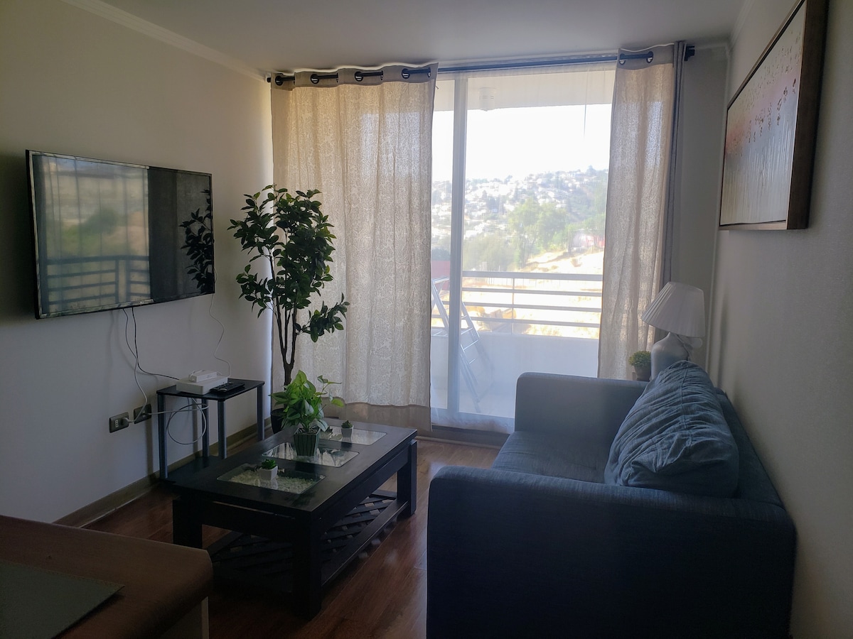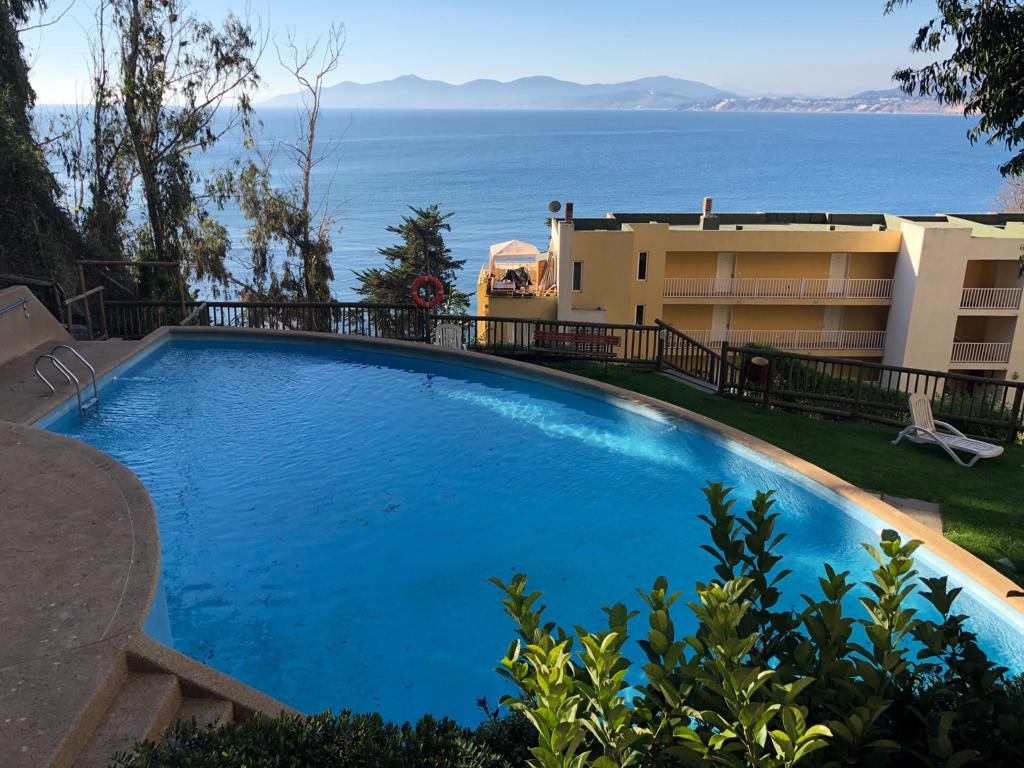 Cabaña una habitación grande, hasta 4 personas, terraza espaciosa frente al mar. 1 baño; cama y sofá cama 2 plazas; 1 closet; comedor, cocina equipada, parrilla gas ; TV SMART, WI FI ENTEL 400 MB FIBRA OPTICA; parlante, cerradura con clave; un estacionamiento interior gratuito .Piscina grande; conserje 24 horas, cámaras. Mascotas: Solo perros, cargo adicional 10.000. Terraza en altura., camino con escalas. Ingreso: 15.30 horas flexible. Salida: 12.30 horas, conversable. No lavandería.