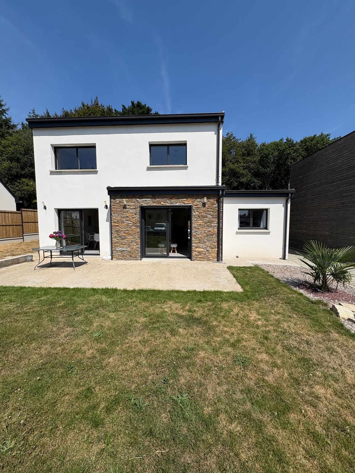 Casa de nueva construcción contemporánea situada en Pont Scorff pequeña ciudad de #Bretaña Sur - a 15 minutos de #Lorient y las playas de #Guidel. Ubicada en una urbanización reciente. Consta de una cocina amueblada, una gran sala de estar, 2 baños 1 con ducha, 2 baños, 4 habitaciones amplias con estantes. 3 camas dobles y 2 camas individuales. Cuna previa solicitud. Terraza barbacoa La casa es nueva y el jardín está parcialmente cerrado.