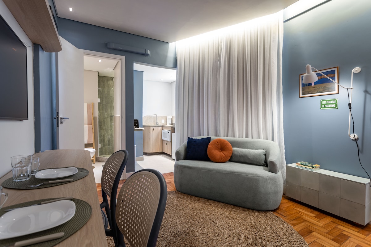 ¡Encantador estudio frente al mar desde donde se ve el amanecer, la puesta de sol y el movimiento del paseo marítimo más famoso de Copacabana! En el apartamento: * Cama doble estándar * Cocina completa * Baño con secador de pelo * Lavadora * Sofá y mesa de comedor * Smart TV * Ventana insonorizada y aire acondicionado split * WiFi y escritorio * Self-check-in En el edificio: * Conserjería 24 horas * Guarda de equipajes Cerca de: * Metro Cantagalo: 7 min a pie - 500m * Restaurante y bares: 1 minuto a pie