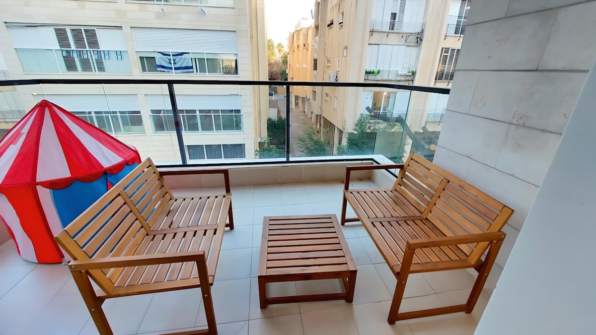 Elegante y céntrico apartamento de 2 dormitorios y 2 baños con terraza privada, adecuado para una familia de 4 personas. Disfruta de una cocina totalmente equipada con horno, microondas, lavavajillas, nevera, congelador, dos fregaderos y dos juegos de platos (carne y lácteos). Ambas habitaciones son acogedoras con amplio espacio de almacenamiento. La terraza incluye una zona de estar, lavadora, secadora y parrilla. Perfecto para familias o viajeros de negocios El apartamento es kosher y está cerca de muchas sinagogas. Nota: el apartamento cuenta con un refugio