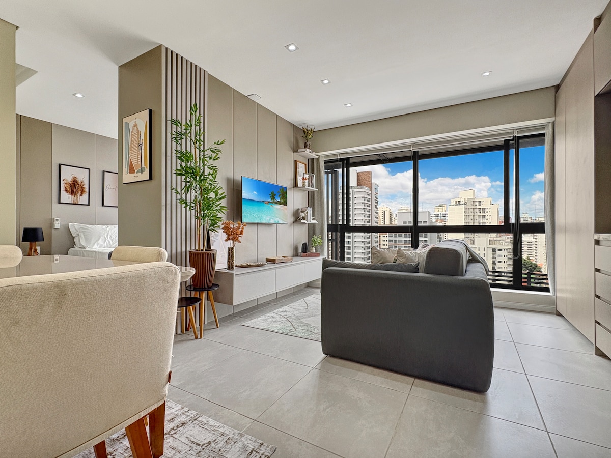 Estudio de lujo en la calle Oscar Freire Moderno, sofisticado y completo, en la calle más famosa de São Paulo por las tiendas de lujo. Estudio en el piso 24, de frente, con magníficas vistas a la Av Paulista. Bien equipado, con TV de 55 pulgadas, Wifi Internet Vivo Fibra 200, TV por cable, Aire Acondicionado silencioso, Cafetera, Cocina y Minibar, Cortina black-out automatizada, Plancha portátil, Utensilios de cocina, Secador de pelo, Sábanas y Toallas suaves, jabón y kit de champú/acondicionador.