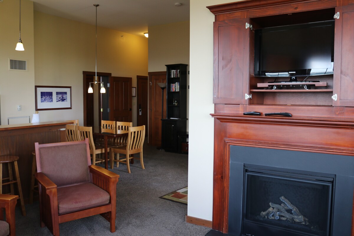 ¡La mejor ubicación en la montaña! Entra y sal con tus esquís en el corazón del pueblo. ¡A poca distancia a pie de todo! Este apartamento de la ladera de Highland House, en el primer piso, tiene vistas al telesilla Ballhooter y al Skidder... mucha acción para ver y escuela/clases de esquí justo en la puerta trasera. Este acogedor y elegante apartamento está en perfectas condiciones, bellamente amueblado con sábanas de lujo, chimenea, cama tamaño queen nueva, sofá cama tamaño queen nuevo de espuma viscoelástica, nevera/congelador, microondas, tostadora, platos y mucho más.