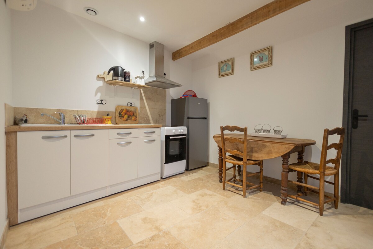 Fully equipped T1 apartment, accommodating 2 people, located in the garden of La Sousto de Lili. It features a fully equipped kitchen, a bathroom, separate toilets, and a bedroom with a 180 cm bed, which can be converted into two 90 cm beds. The view from the windows overlooks the guesthouse's garden, where you can enjoy the swimming pool, the spa, and the pétanque court.