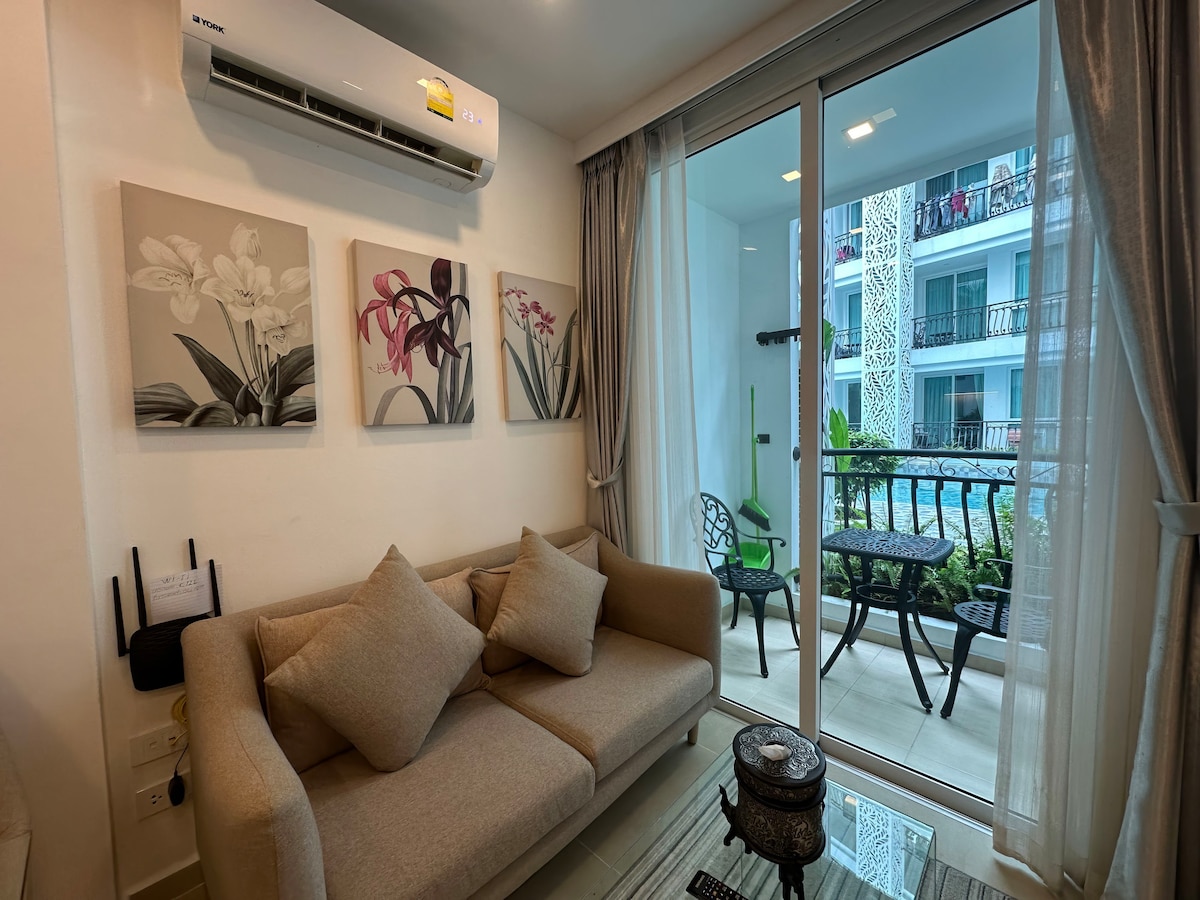 ¡Te damos la bienvenida al condominio Qihai Fase 1 de Jomtien Beach Pattaya! El departamento está ubicado en la tranquila y conveniente zona de Zhongtian, a unos 10 minutos a pie de la playa de arena suave y con vista al mar.Este es más que un lugar para alojarse, es una experiencia de vacaciones inmersiva: el vecindario se centra en un complejo de piscinas multitemáticas cuidadosamente diseñado, con múltiples piscinas conectadas como zafiros, con características de agua, como si te alojaras en un parque acuático privado.También puedes acceder al gimnasio y a la sauna de forma gratuita para mantenerte activo y relajarte durante tu viaje. Esta acogedora habitación de estilo crema cuidadosamente organizada, con tonos suaves y un ambiente cómodo, te ofrece el lugar ideal para relajarte durante tu viaje.La habitación está totalmente equipada: · El área del dormitorio está equipada con una cómoda cama doble, ropa de cama suave y agradable para la piel. · Áreas húmedas y secas separadas en el baño privado, suministro de agua caliente las 24 horas; · Cocina americana totalmente equipada: nevera, microondas, cocina de inducción, utensilios básicos de cocina, comidas sencillas fáciles de preparar. · Se preparan artículos de primera necesidad como cepillos de dientes desechables, zapatillas, pañuelos desechables, detergente para ropa, etc. para una estancia sin preocupaciones; · El balcón tiene una lavadora y un estante colgante que se puede subir y bajar, lo cual es muy conveniente.La vista fuera de la ventana es abierta: hay un exuberante cinturón verde cerca, y se puede ver el mar y el cielo a lo lejos, con una vista por la mañana y por la noche. Tiene la comodidad y privacidad de la vida en un apartamento, así como el ocio y el romance de un centro vacacional.Ya sea una escapada en pareja, unas vacaciones familiares pequeñas o un grupo de amigos, aquí puedes encontrar comodidad y alegría. ¡Esperamos agregar una sensación de paz y belleza a tu tiempo en la playa en Pattaya!