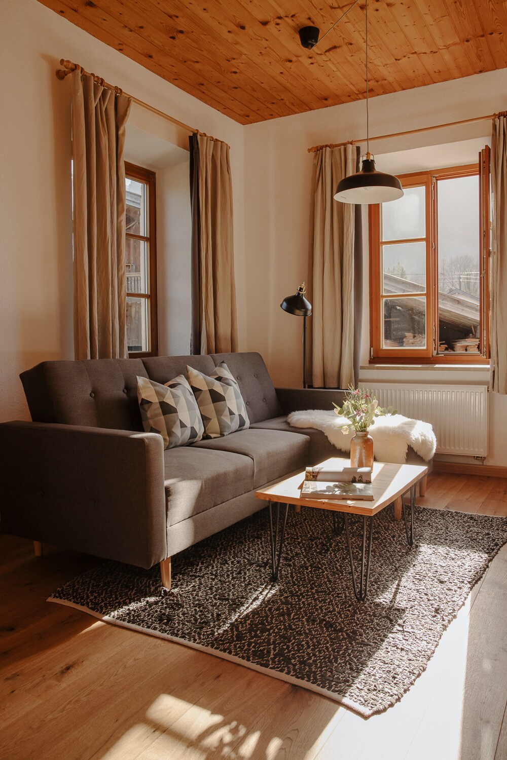Die ca. 53 qm große Wohnung liegt sehr ruhig und malerisch am Fuße der Alpen. Sie ist liebevoll in einem Mix aus bayrischen und modernen Stil eingerichtet. Die Wohnung verfügt über einen großer Wohn- und Essraum, eine separate Küche, ein schönes Schlafzimmer mit Blick auf die Berge und ein helles, geräumiges Bad mit Wanne. Für ausgedehnte Frühstücke und Abendessen eignet sich der geräumige Eckbalkon mit Bergblick.