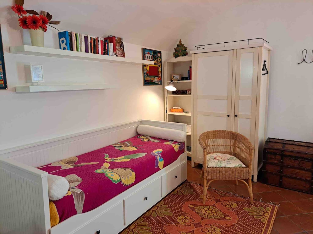 La torretta bnb es un pequeño y encantador estudio con entrada independiente, está en el 3.er piso y 1/2 del edificio sin ascensor. - Entrada con mininevera, cafetera y hervidor. - Dormitorio con baño. 11 m² en total: cama individual con 2 cajones grandes con mantas y edredones adicionales. Perchero. Mesa de desayuno y dos sillas. Baño con inodoro, lavabo con cajones para guardar objetos personales y ducha. - Terraza panorámica de 11 m².