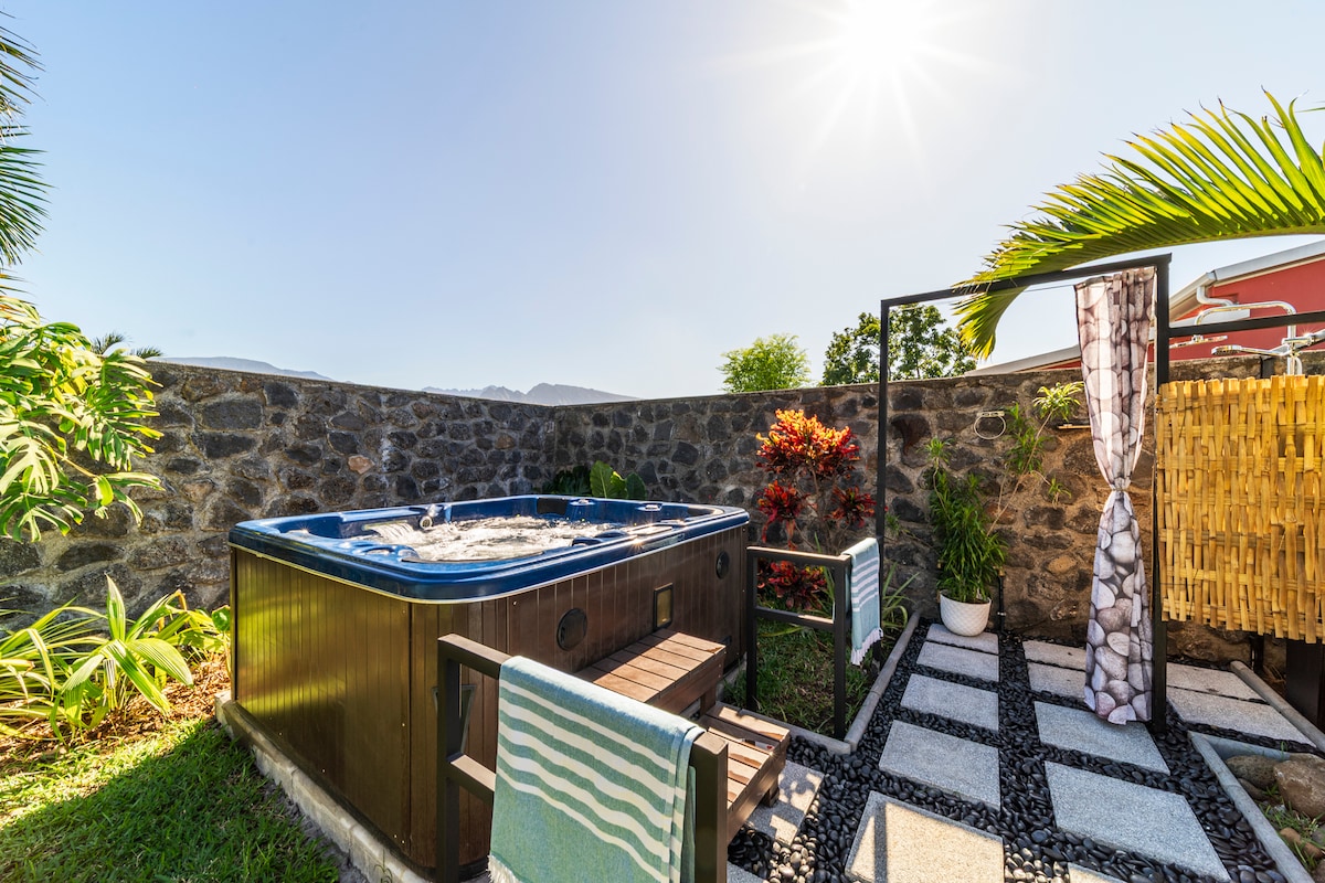 Disfrute de la naturaleza en el sur de la isla de la Reunión. Lujo y romanticismo en una casa con terraza, y jacuzzi, solo para usted. Con espectaculares vistas al océano Índico, junto a un barranco verde y una cascada. Relájese en la cama de agua y disfrute de la tranquilidad, los aromas y los sonidos tropicales. La cocina equipada ofrece todo para una agradable comida compartida. La gran televisión con Netflix, Playstation y WiFi gratuito ofrece entretenimiento para grandes y pequeños.