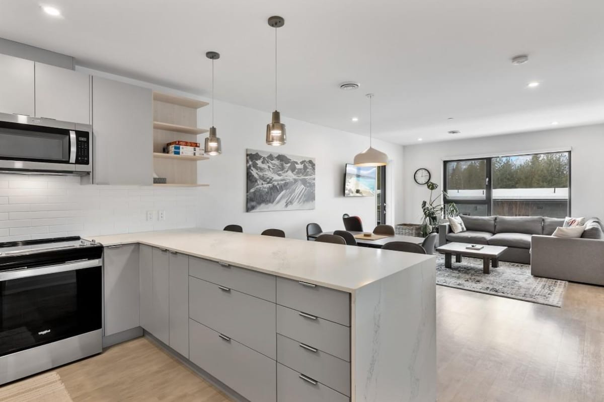 Moderno departamento de 2 dormitorios a solo 5 minutos del Revelstoke Mountain Resort y del centro de la ciudad. Ubicado en un barrio tranquilo, en una plaza muy bien situada, con spa, gimnasio, estudio de pilates, tienda de comestibles, licorería, restaurante, guardería y panadería en las inmediaciones. Disfruta de una cocina totalmente equipada, lavandería en la suite y estacionamiento subterráneo. Relájate en la espaciosa terraza con vistas a la montaña o descansa en el interior en el amplio sofá modular después de un día de exploración. Un punto de partida cómodo y bien ubicado para tu estadía en Revelstoke.