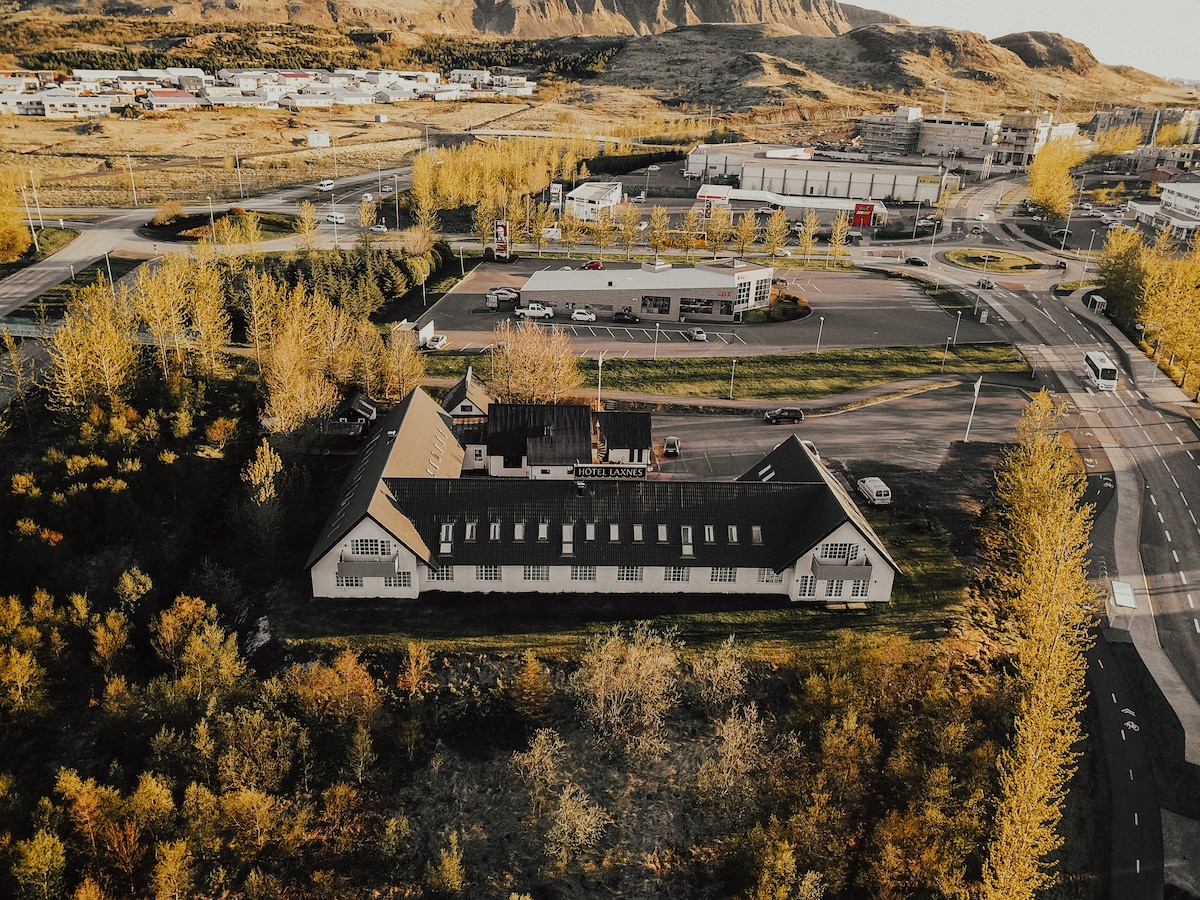 Te damos la bienvenida al Hotel Laxnes . Nuestro acogedor hotel está en la ciudad de Mosfellsbær, justo al lado de la pintoresca Ring Road. El hotel es el punto de partida perfecto para los huéspedes que valoran la comodidad y la estancia tranquila: ¡un gran comienzo para explorar tu Ring Road! Nuestro hotel cuenta con una bañera de hidromasaje disponible para nuestros huéspedes por 1000 ISK por persona. ¡Tenemos personal disponible para responder a tus preguntas y esperamos darte la bienvenida!