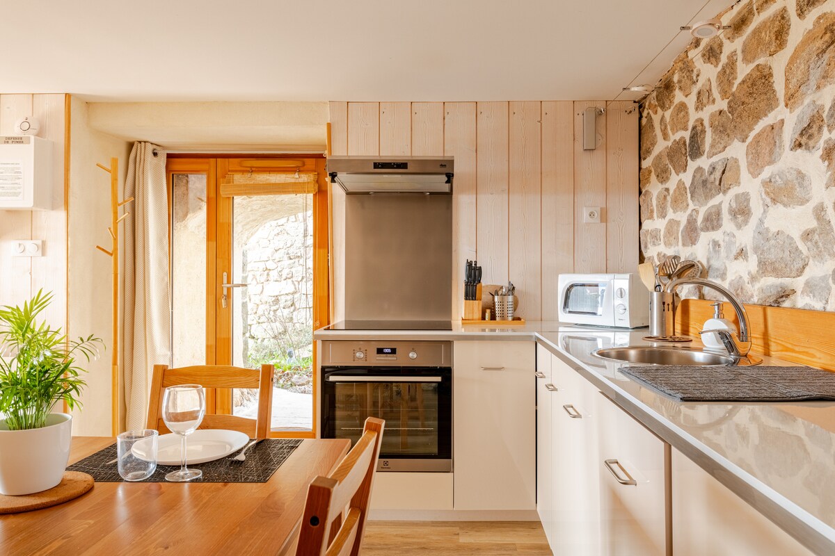 Encantador nido en plena naturaleza – Un lugar para reponer energías, en el corazón de una aldea tranquila. Bienvenido a este alojamiento con todas las comodidades, ideal para 2 a 3 adultos, completamente nuevo y de una sola planta, con un ambiente cálido y cuidado. Combinando el carácter de la piedra con materiales nobles y de calidad, le da la bienvenida durante todo el año para una estadía bajo el signo de la calma y la serenidad, donde cada detalle está pensado para su bienestar.