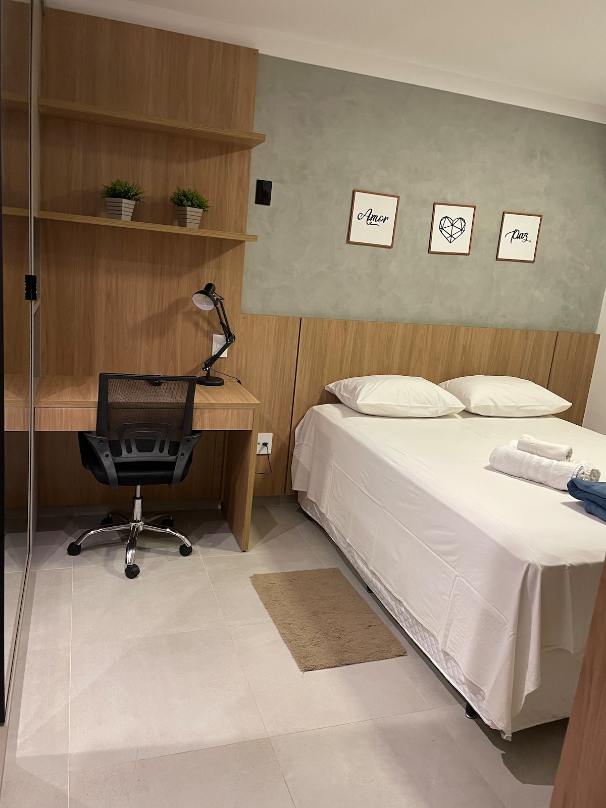O ap é um STUDIO (pequeno)bonito e aconchegante mobiliado com vários itens pra vc ficar vários dias,o colchão é de espuma e bem firme, a TV contém vários canais esportivos, filmes etc. EU mesmo faço a limpeza do AP (Dentro do Prédio possui um mercadinho com vários intens de bebida e comida para facilitar a vida do hóspede)o prédio é calmo, tranquilo e Fácil acesso! check in pode ser feito na portaria ou comigo, prédio perto de 2 shoppings,bares,Fatesa,Unip, pizzaria, posto de gasolina..