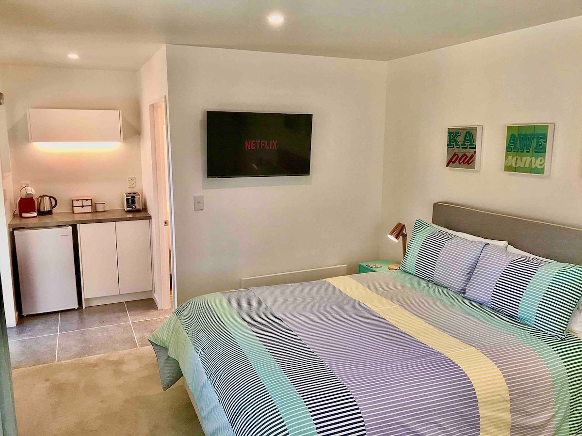¡Te damos la bienvenida a nuestra luminosa y espaciosa habitación estudio con baño que tiene todo menos el fregadero de la cocina! Acceso privado a través de puertas francesas a un jardín con patio donde podrás disfrutar de un café. Eres autónomo. Nuestro hogar te ofrece un refugio tranquilo y cómodo desde el que explorar todas las cosas increíbles que tiene nuestra región. Cerca de Great Taste Cycle Trail, el estadio Saxton y campos deportivos. Céntrico para explorar toda la región. Estamos a 12 minutos (aprox.) en coche del centro de la ciudad de Nelson.