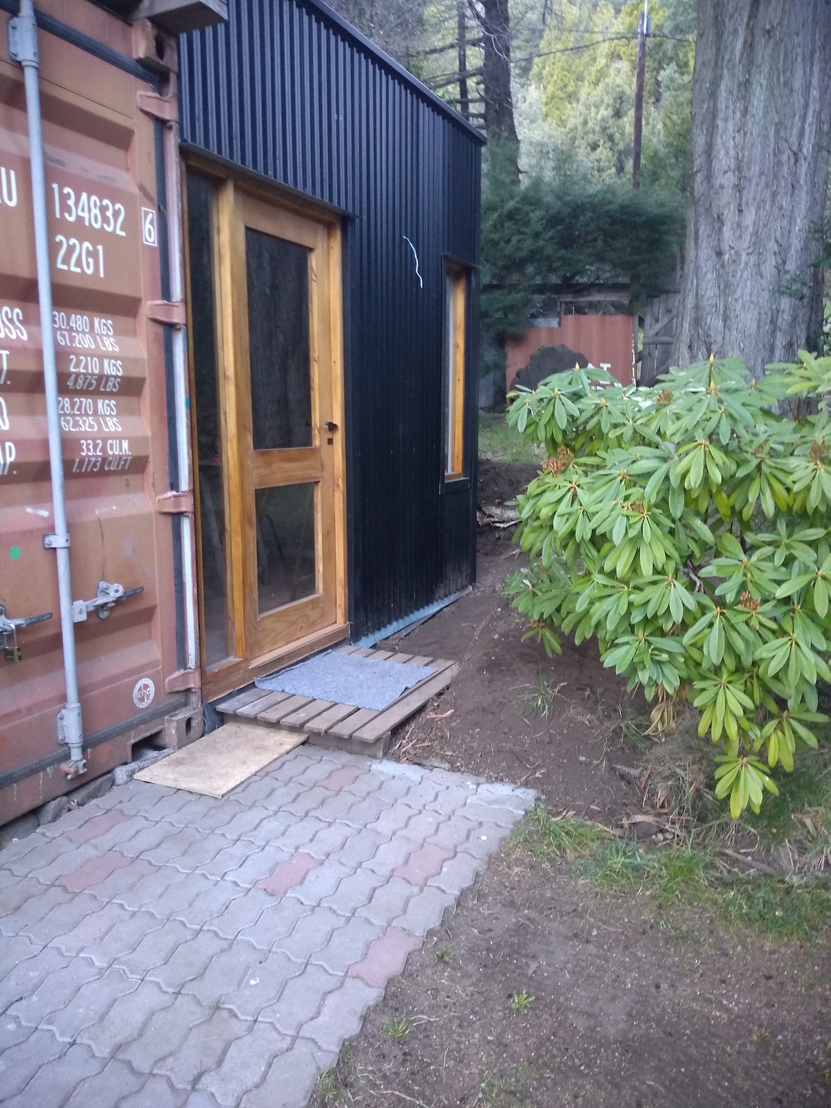 Esta casa-container está inserta en un bosque de cipreses y radales, con un lindo jardín. La zona es muy tranquila, es un barrio residencial que queda a unas 12 cuadras del centro de Bariloche. Tienen una pequeña habitación con una cama de dos plazas, placard, baño con bañadera y la cocina integrada al living donde hay un sofá cama ( se transforma en cama de 1.30 de ancho). La cocina tiene una heladera bajo mesada, horno eléctrico con dos hornallas, tostadora y calentador de agua.