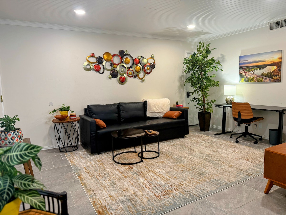 Descubre tu refugio urbano ideal en el centro de Austin, rodeado de una mezcla cautivadora de restaurantes de moda, tesoros vintage, joyas culturales y vida nocturna eléctrica. Este refugio tiene capacidad para 3 huéspedes, envuelto en una lujosa cama tamaño queen y admite mascotas. Sumérgete en el entretenimiento con televisores inteligentes gemelos de 50pulgadas que transmiten Netflix y Philo. Conéctate sin esfuerzo con WiFi de alta velocidad. Encuentra tranquilidad en el patio zen, donde la relajación es una forma de arte. ¡Reserva ahora!