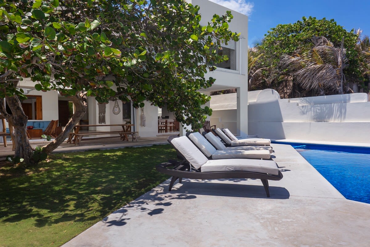 Vive la experiencia de hospedarte en una casa frente al Mar Caribe. Con amplia piscina con calefacción y salida directa a la playa donde en temporadas de tortugas (mayo a octubre) las observaras hacer sus nidos, justo ahí en el patio. Desde la cocina, su balcón como sus tres recámaras te deleitarán con la salida del sol y de la Luna. La gran azotea brinda vistas ilimitadas del mar al oriente y occidente y una espectacular puesta del sol. En esta casa tendrás recuerdos que durarán toda la vida.