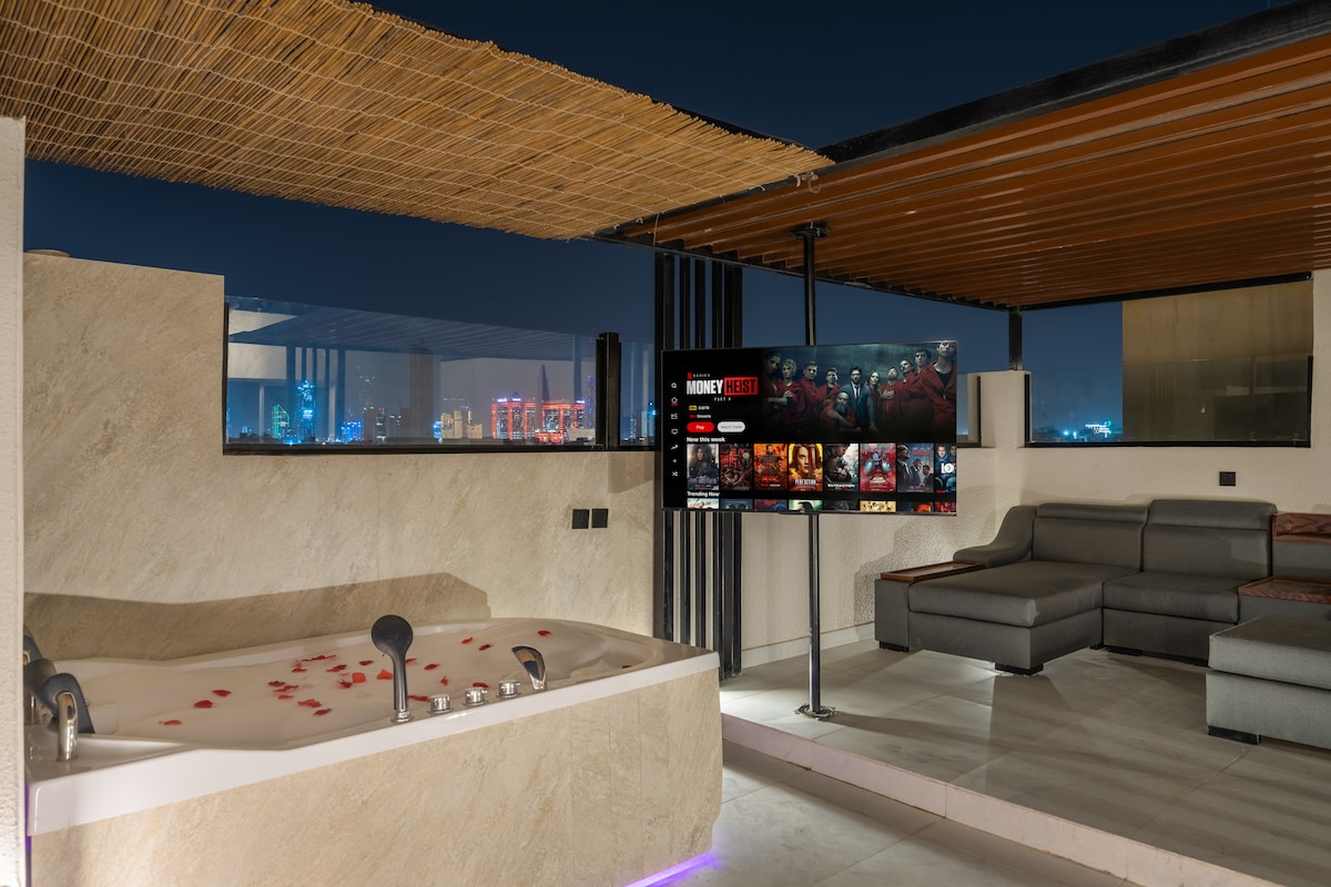 Departamento de 2 habitaciones con jacuzzi en la azotea | QLED de 75” | Vista y niebla