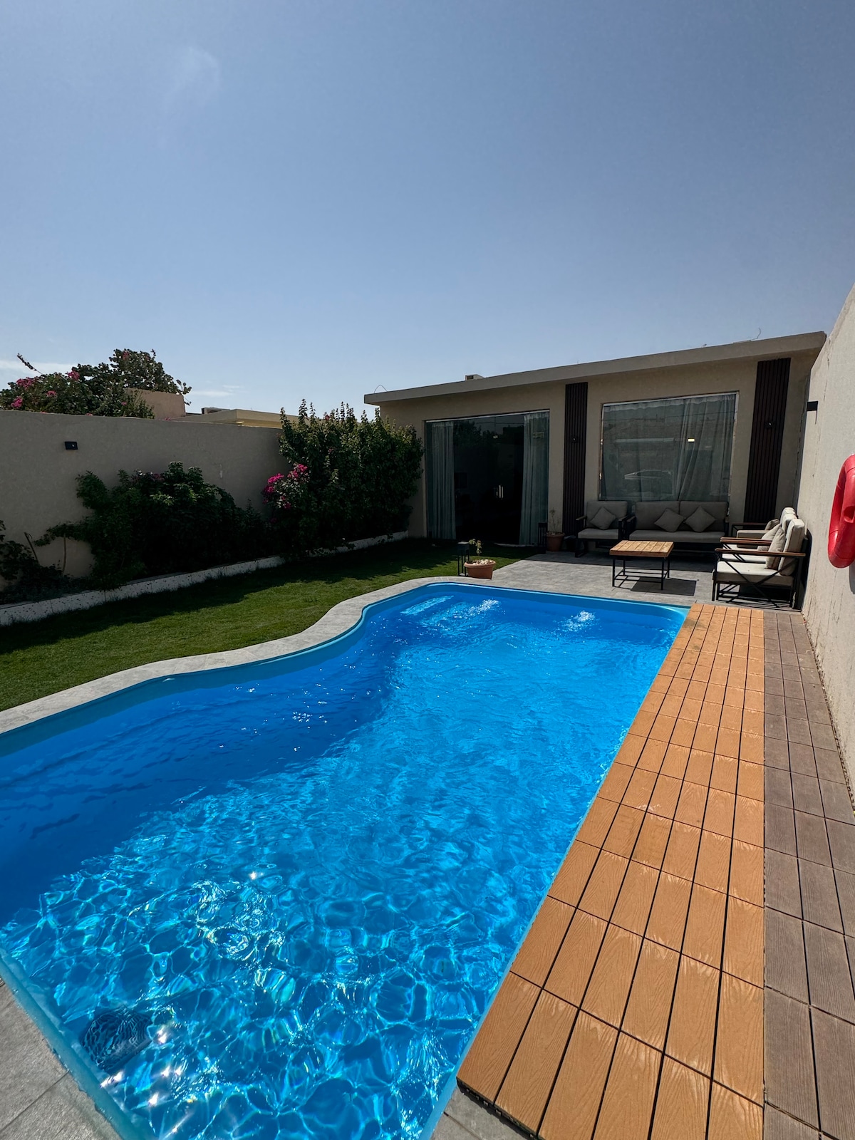 Alquila un chalet de lujo en Al Ramal Disfruta de un ambiente único en un elegante chalet que te ofrece privacidad y comodidad, perfecto para familias y reuniones. Características: Salón para 9 personas. Auriculares y wifi Mini mesa para comer Piscina privada Sesiones al aire libre Dormitorios acogedores. Cocina equipada Estacionamiento privado.