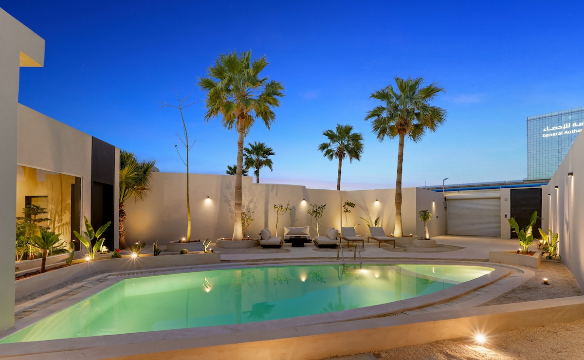 Una lujosa villa de 450 metros cuadrados que combina elegancia y serenidad, idealmente ubicada en Al Thumama Road, a solo 15 minutos del Aeropuerto Internacional Rey Khalid. Cuenta con un dormitorio principal con una cama tamaño king, una cocina totalmente equipada, un elegante comedor, una piscina privada y asientos al aire libre rodeados de vegetación. El refugio perfecto para quienes buscan comodidad, privacidad y relajación. 🌿