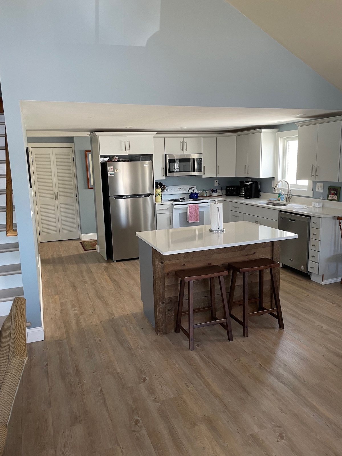 SE TRATA DE LA UBICACIÓN: UN LUGAR PERFECTO Una maravillosa casa de campo decorada náuticamente a dos casas de nuestro otro alquiler. Tiene capacidad para alojar cómodamente hasta 7 personas, incluida una cama principal tamaño queen, una cama de tamaño completo, un futón individual en el loft, así como un sofá cama en la sala de estar.