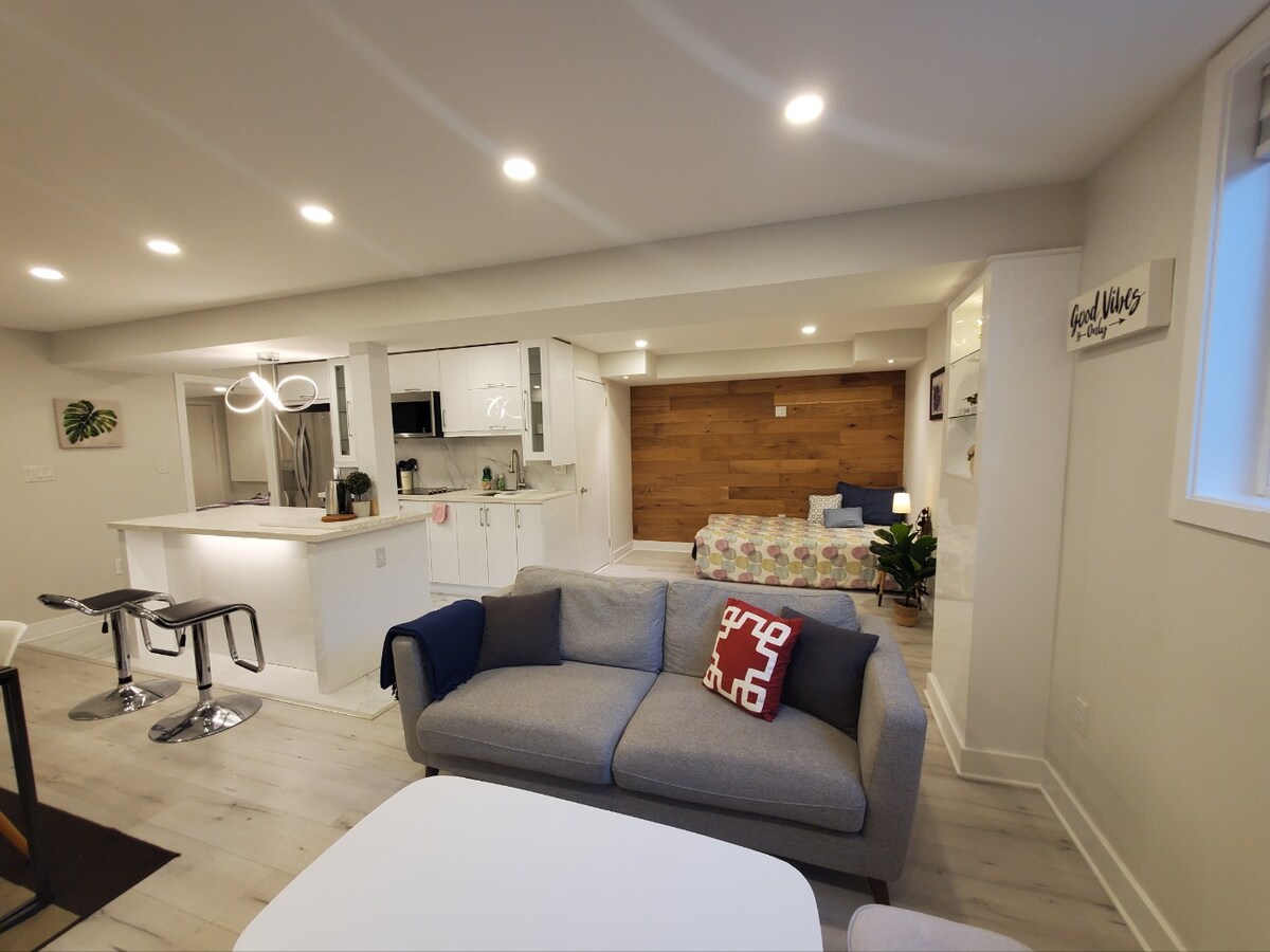 ACOGEDORA y ACOGEDORA, esta moderna suite se encuentra en un barrio tranquilo y familiar de Ajax. A solo 10 minutos de Thermea Spa y Ajax GO Station, y a poca distancia a pie de parques, tiendas y supermercados. Recién construido con acabados de lujo, el espacio de 1000 pies cuadrados incluye calefacción en el piso, una chimenea eléctrica, un amplio sofá y TV inteligente con Netflix/Prime. El centro de Toronto está a 35–45 minutos en auto y el aeropuerto de Pearson o Mississauga a unos 55 minutos.